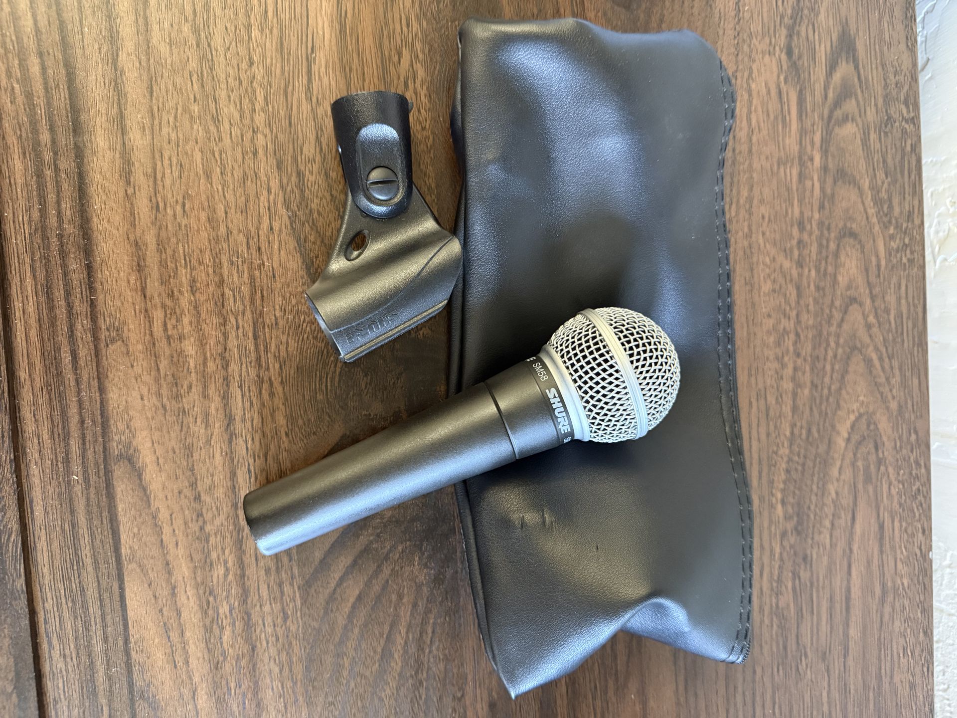 Shure SM58 dynamic vocal microphone in excellent working condition. This is the industry-standard mic known for its durability and clear vocal sound. Fully tested and sounds great with no issues. Includes original Shure mic clip and Shure zipper pouch (case). Both are in good condition and securely hold and protect the microphone.