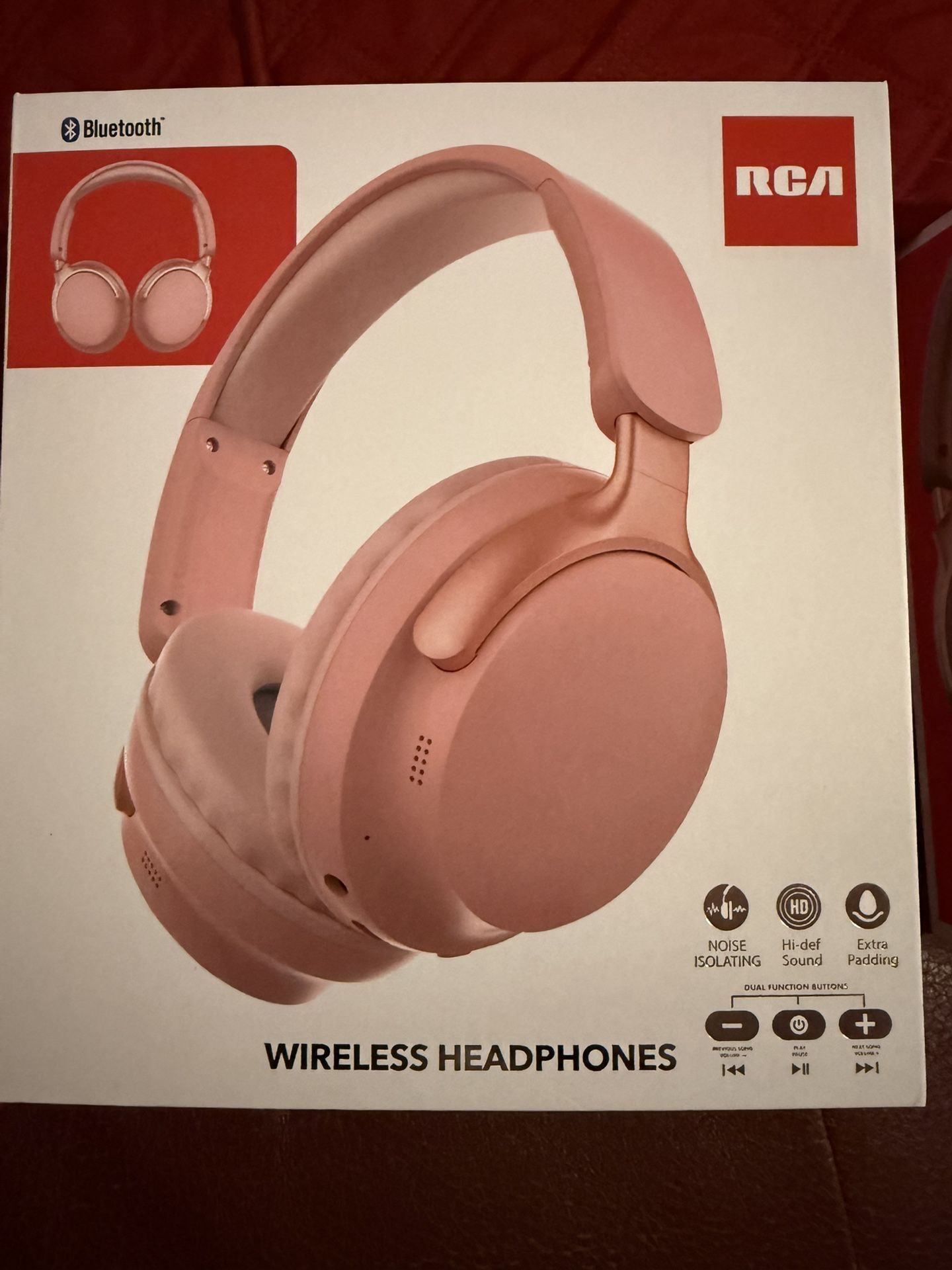 New RCA wireless headphones wave 58 pink. Has noise isolation, hand free calling, Hi-def sound, ultra bass and built in mic and more.