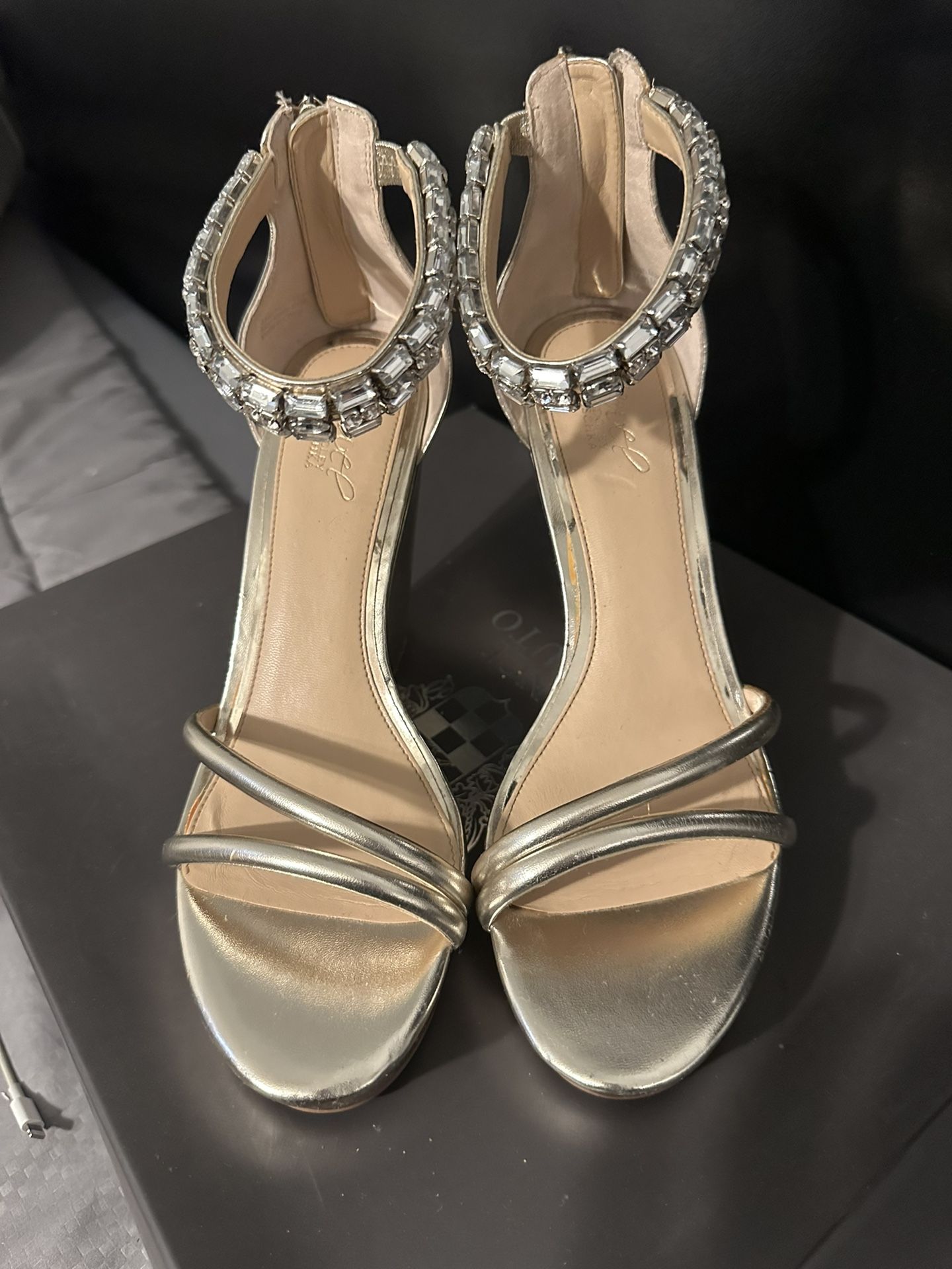Worn once to a wedding light gold jeweled platform sandal are super cute will get tons of compliments Asking $40