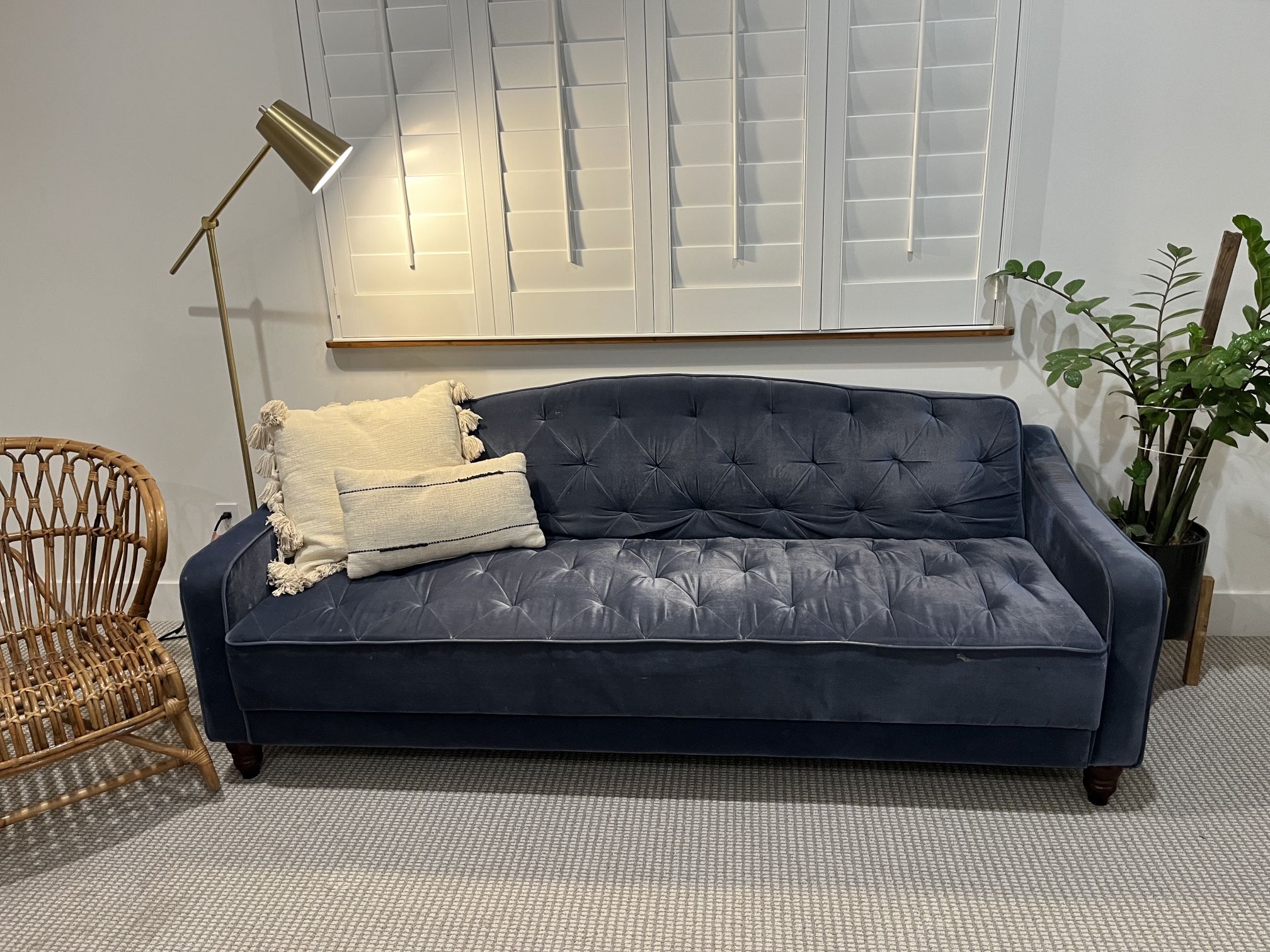 Some wear and small tear shown in pic. Back is slightly broken, left side hinge is loose. Needs slight support against a wall on left side. Back lays down into futon-style. 81” long x 32” high x 32” deep