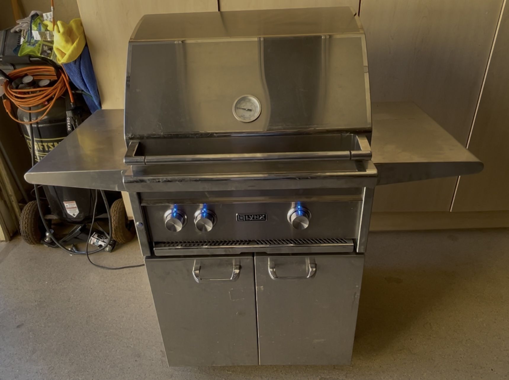 This grill is awesome. It has one trident burner and one regular burner with ceramic briquettes. It also has a rear rotisserie burner.