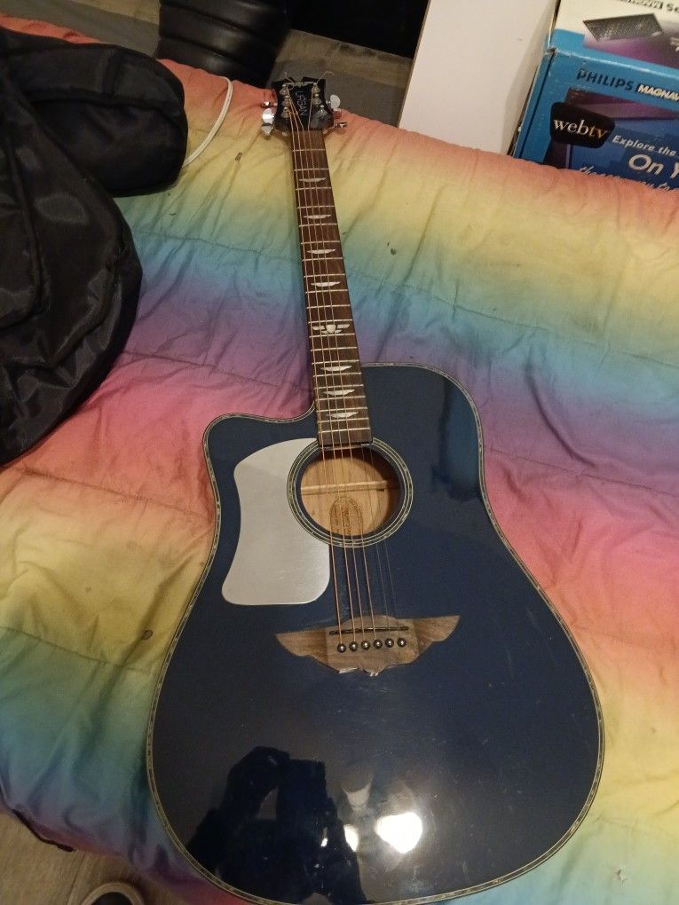 This is a beautiful guitar, by urban.... Sounds beautiful, made for left hand guitar players.... It's electric and has a built in tuner and comes with a soft case !