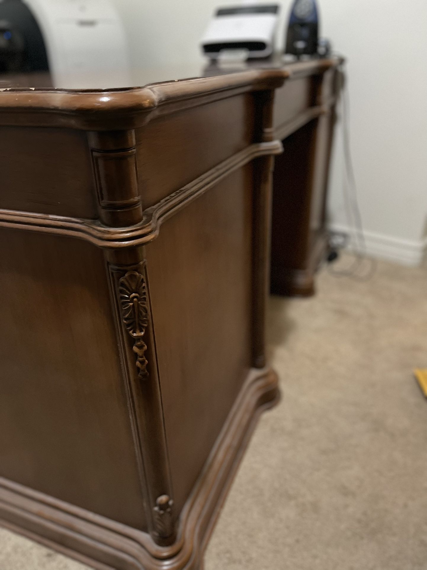 This is a traditional, executive-style wooden desk with a classic and ornate design. Here are some notable features: • Material & Finish: The desk appears to be made of solid wood or wood veneer with a polished, warm brown finish. • Design Elements: Decorative carved accents adorn the drawer fronts and sides, adding an elegant, antique look. Rounded edges and fluted columns on the corners enhance the classic aesthetic.