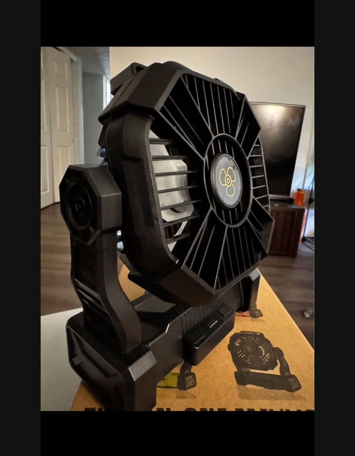 New in box RECHARGEABLE FAN with light and cellphone power bank. Fan 3-in-1 Electric Camping Fan with LED Lantern Portable Tent Fan, Car RV Fan with Hook with Timed Rotation Function for Barbecue Travel Operation Fan, Portable Camping Fan, Camping Fan Rechargeable, Camping Accessories, Camping Gear. ITEM LOCATED IN CONCORD NC BY THE CAROLINA MALL ON CONCORD PARKWAY.