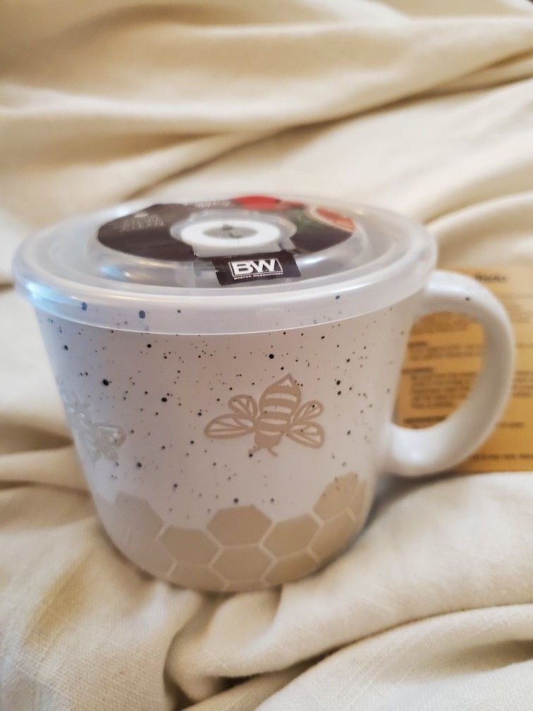 Honey bee design. 20 ounce ceramic mug with plastic lid and timer. Dishwasher, oven, and microwave safe. BPA free. Great gift for anyone and any occasion including soup, coffee, and tea lovers! Diseño de abejas. Taza de cerámica de 20 onzas con tapa de plástico y temporizador. Apto para máquinas de lavaplatos, horno y microondas. Libre de BPA. ¡Gran idea de regalo para cualquier ocasión y cualquier persona, incluidos los amantes de la sopa, el café y el té!