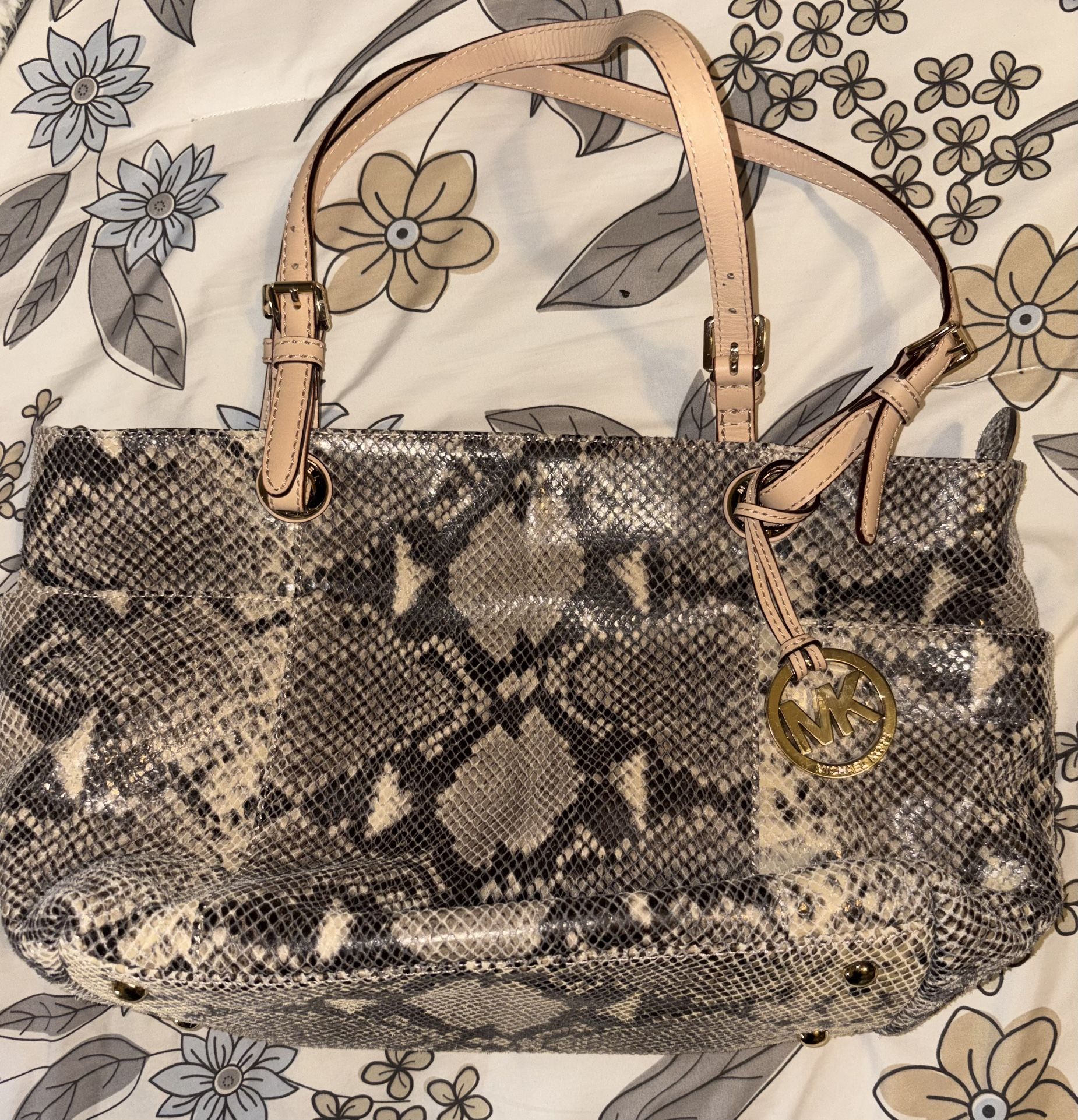 Good condition; never used but some wear on left and right corners of bag from not storing properly; cracked interior lining very minimal as shown in pics; The bag is made with snakeskin or snake-embossed leather, in a tan and black color scheme; gold-tone hardware accents, including a logo charm; tote or hobo-style silhouette with structured top handles; interior includes pockets and a zippered enclosure for organization; original price $398
