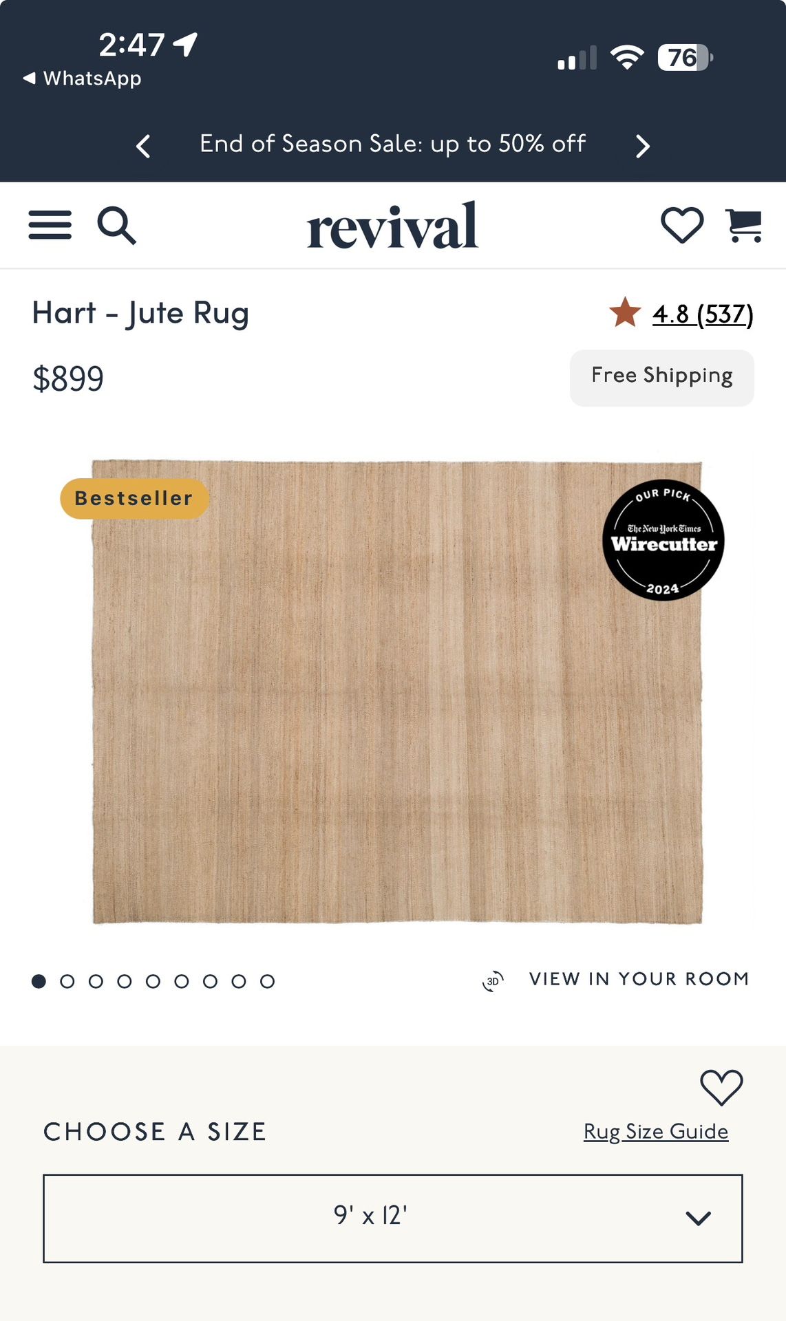 It is brand new! It was too big for our room and cannot return. Will take good and serious offers. Jute Rug