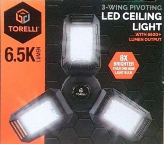 New! Torelli Tools 3-Wing Pivoting LED Ceiling Light. - 6500+ Lumen output. - 8x brighter than one 60w bulb. - E26 thread. - No tools needed. Just screw in light socket. No holds or deliveries. Pick up only. First come, first served.