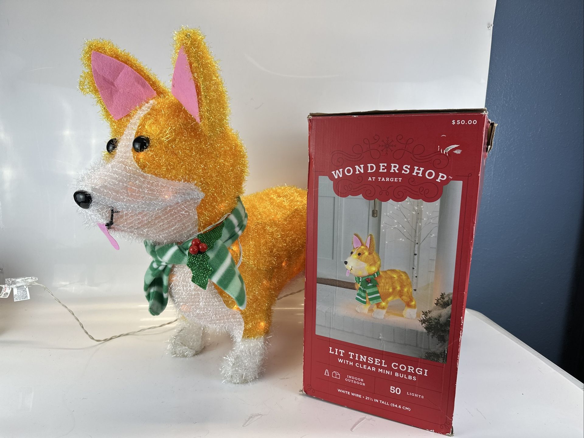 This adorable 21-inch Lighted Tinsel Corgi Dog Christmas Decoration features 50 clear lights and is designed for indoor or outdoor holiday displays. The corgi lights up beautifully and makes a fun, festive addition to porches, entryways, windows, or yard decor. The decoration is in good working condition, and all lights function properly. It includes the original box, which shows normal storage wear. The corgi itself has light cosmetic wear from seasonal use but no major damage