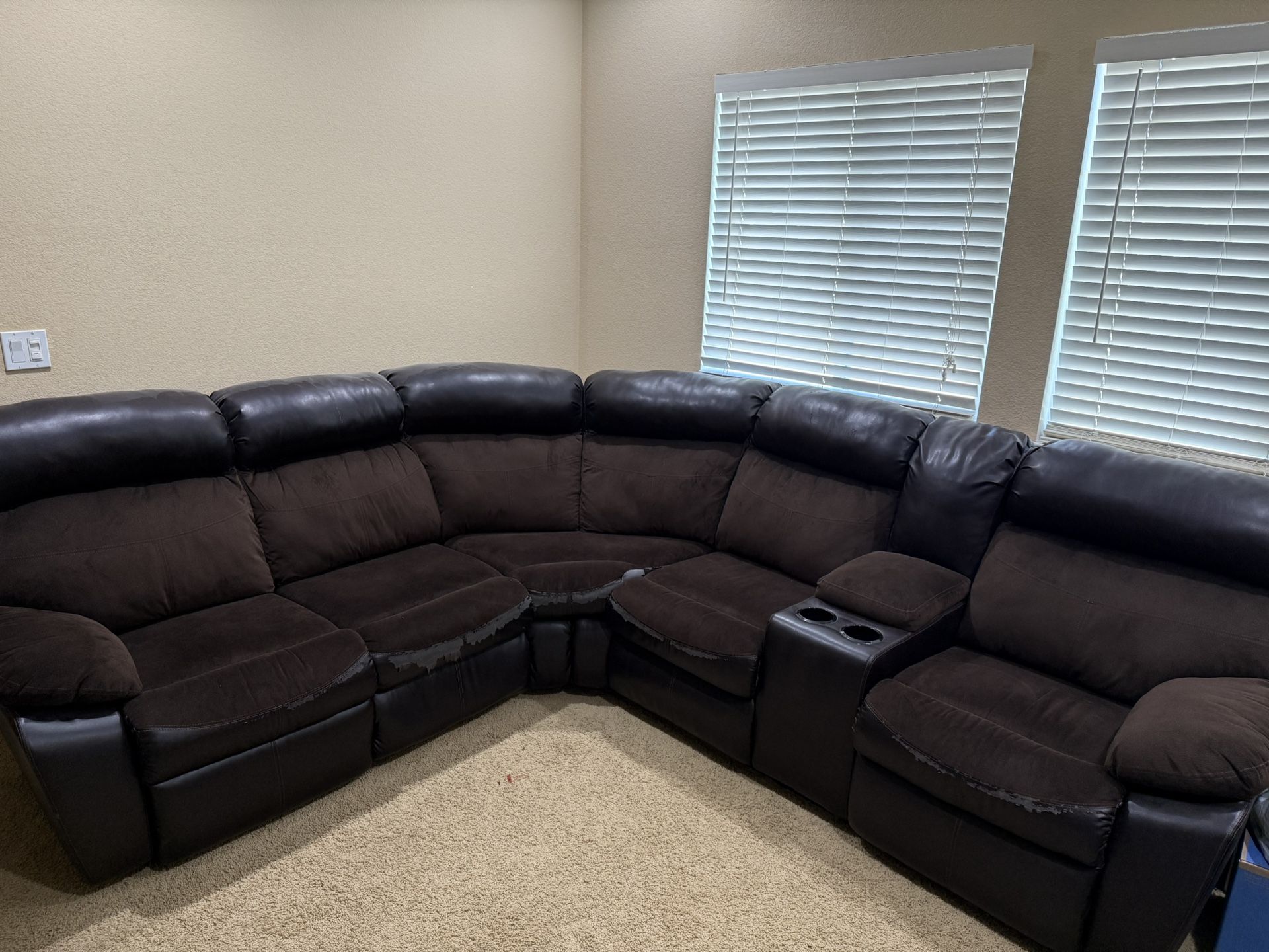 Brown colored, L shape sofa set. Both ends have manual reclining chairs. Console with 2 cupholders. Cloth material with some synthetic leather, which is peeling in certain locations as seen in pictures. Sofa rarely used, padding firm and great condition. Dimensions: 100” x 117”