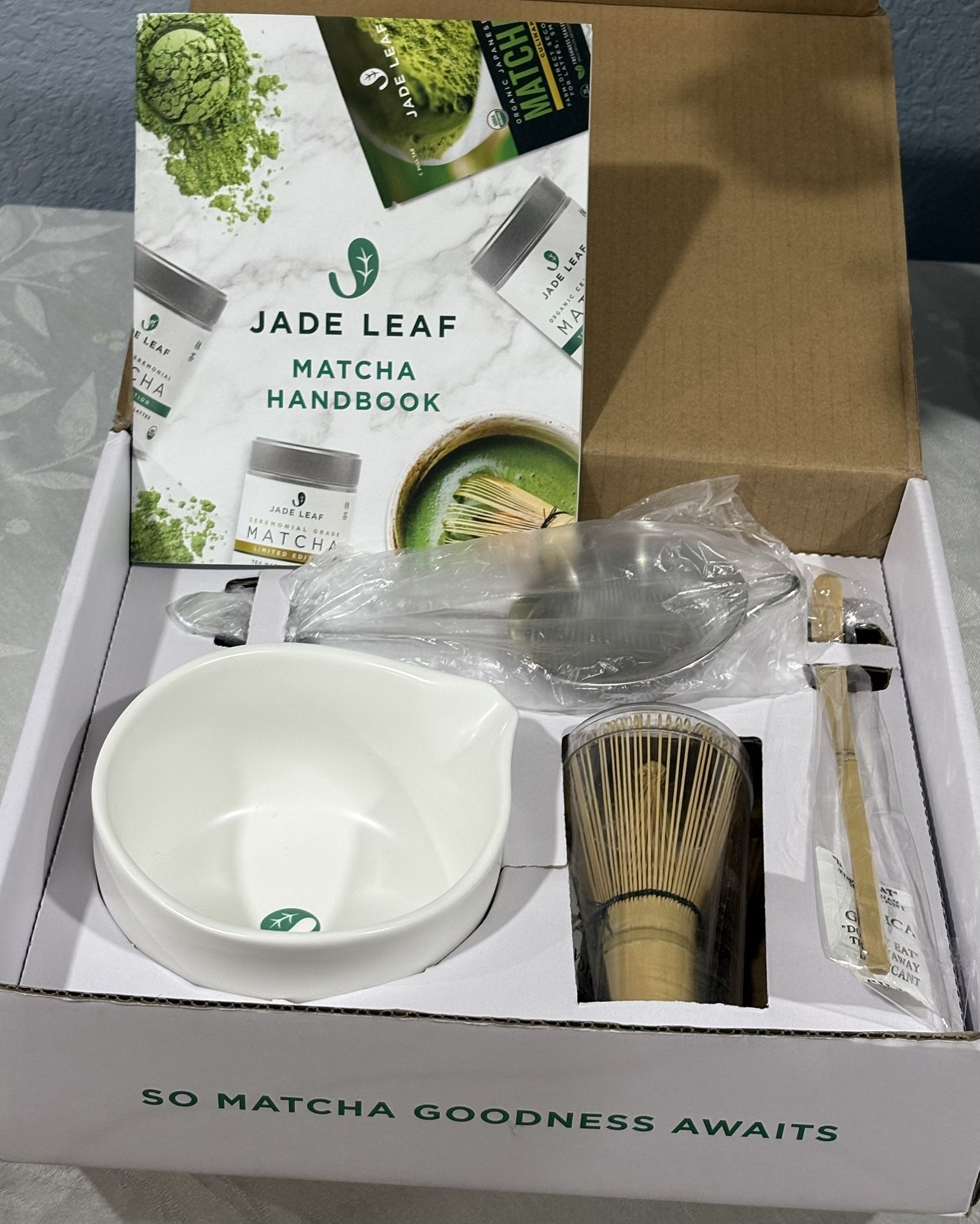 New Open Box Jade Leaf Matcha - Complete Matcha Whisk Set - Ceremonial Gift Set Includes: Bamboo Matcha Whisk & Scoop, Stainless Steel Sifter, Stoneware Bowl & Whisk Holder, and Prep Guide