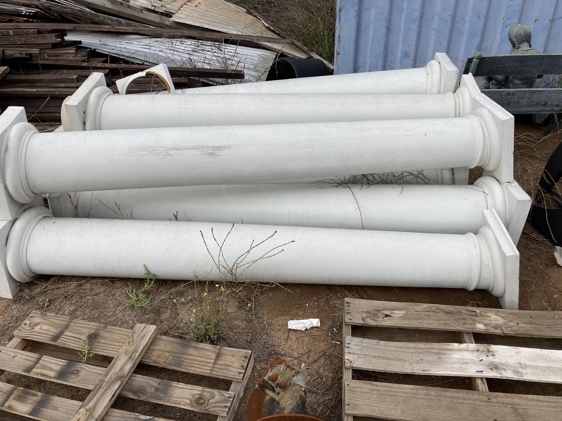 They vary in condition. 8’ tall and 10” diameter tapered. These go for $347 new(search: 10” dia. x 8’h endura-stone column, round shaft w /true entasis taper Tuscan base and Tuscan capital), I’m looking for $100 apiece.