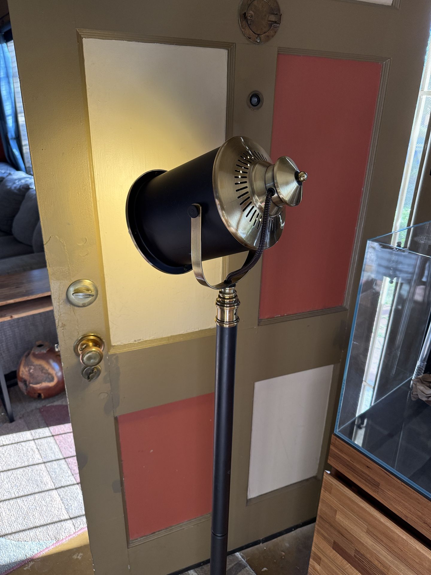 Jimco Manufacturing Spotlight Floor Lamp Stylish and functional floor lamp The lamp is powered by a cord and has an antique brass finish with subtle brown accents. Made with brass material, this lamp is durable and adds a touch of vintage charm to any room 56” tall Excellent condition 175 or best offer