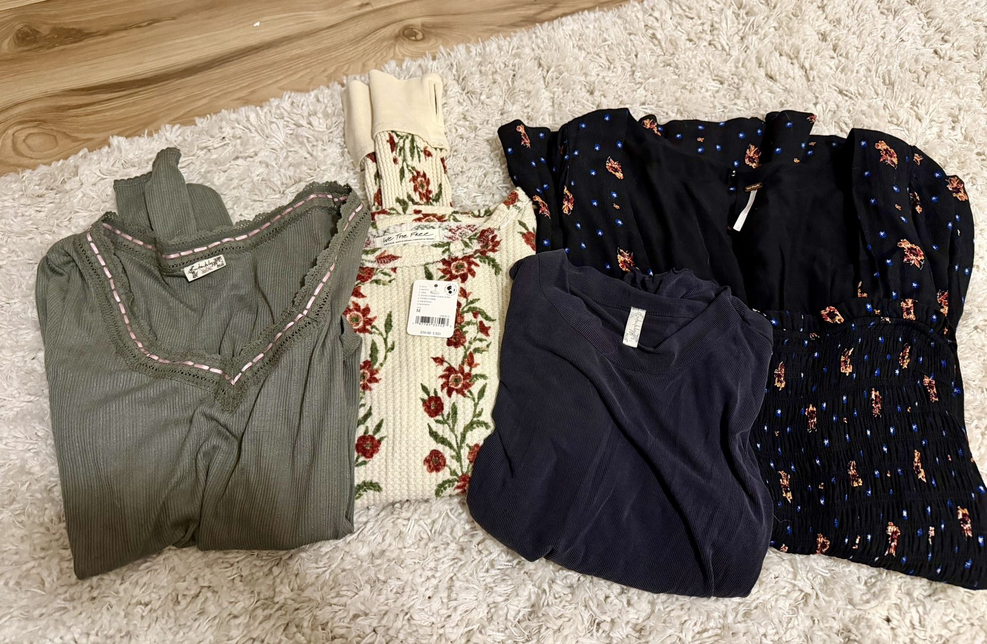 3 long sleeve, one dress. Green long sleeve size M, floral thermal size M, black ribbed size S, floral dress size S, but fit like mediums. All in new condition, thermal still has tag.