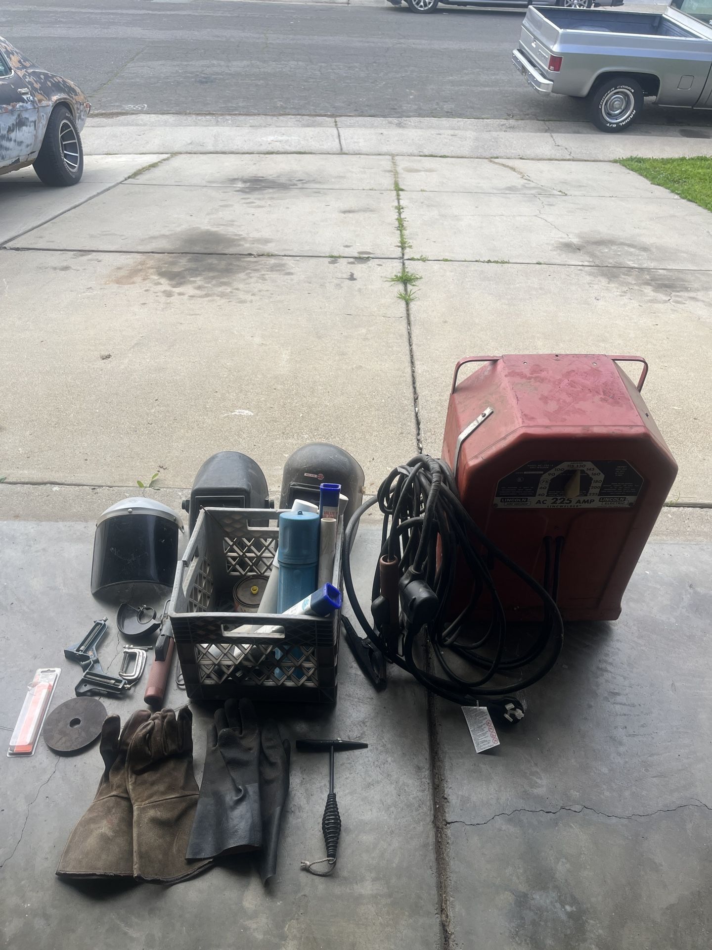 It comes with new electrode holder, gloves, helmets, 30amp adapter so you can connect it to the dryer outlet, different size rods and everything else that you see in the pic. Last time I used it, it was working just fine.