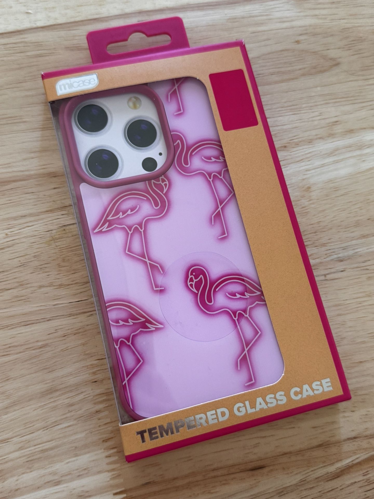 iPhone 15Pro tempered glass case with neon pink flamingos New, never used. Pick up in 92126
