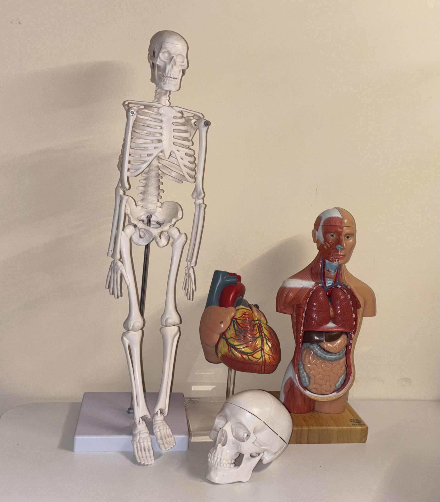 Human anatomy model bundle including skeleton, heart, and skull with brain. Great for study, teaching, art reference, or display. Clean and well cared for. See photos for condition.