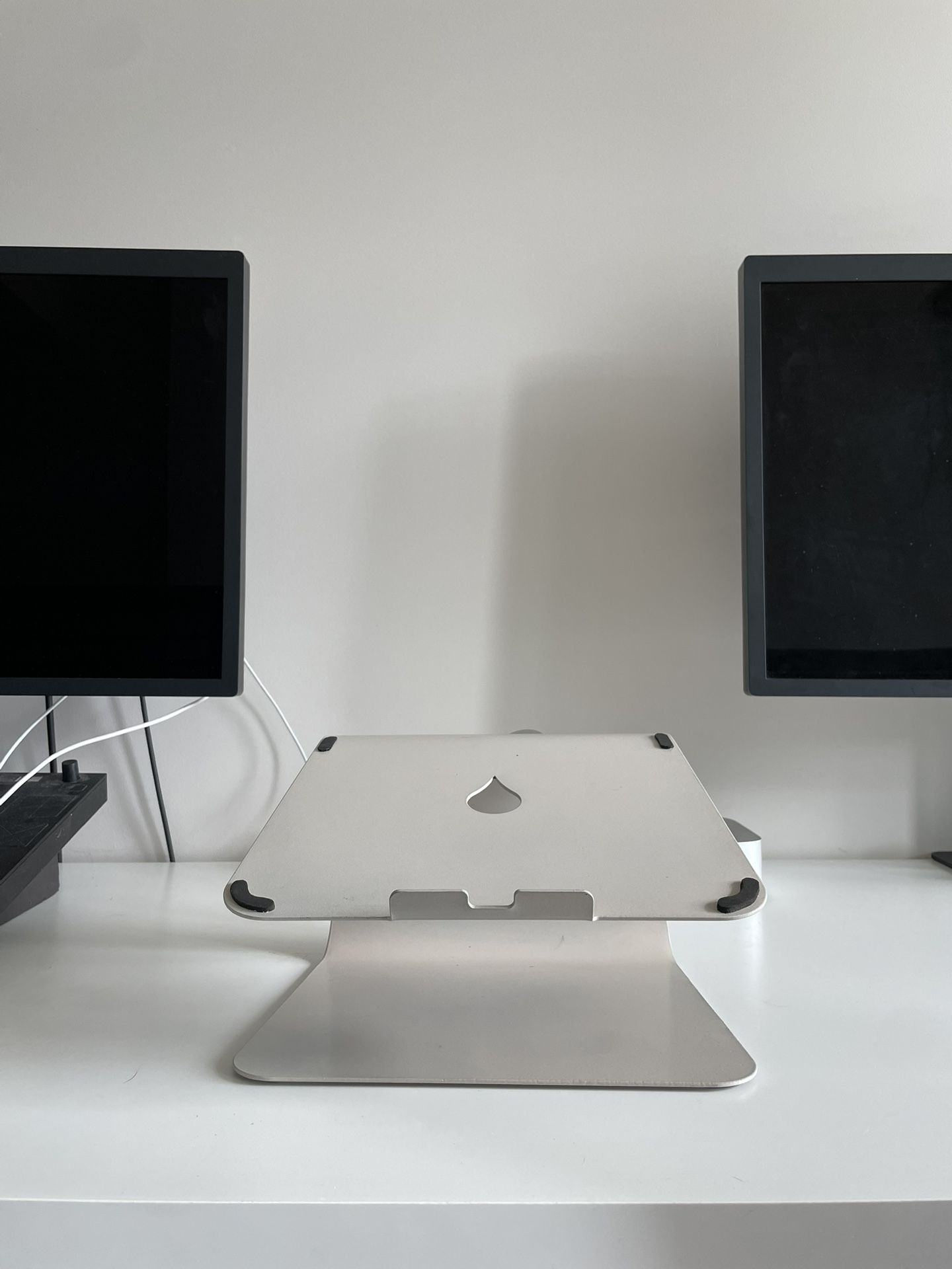 * Like new condition, retail $40. * Raises notebook screen height to eye level for better ergonomics (5.9 inches). * Single piece aluminum design provides solid stability and acts as a heat sink to cool laptop * The back cable management hole is 2 inches in diameter. Cable organizer behind routes wires neatly * Sand-blasted and silver anodized finish matches Apple notebooks. Keyboard stash clears up desk area when not in use * Compatible with Apple Macbook Pro, Macbook Air and other laptops with depths less than 10.4 inches * 10” wide x 9” deep x 5.5” tall