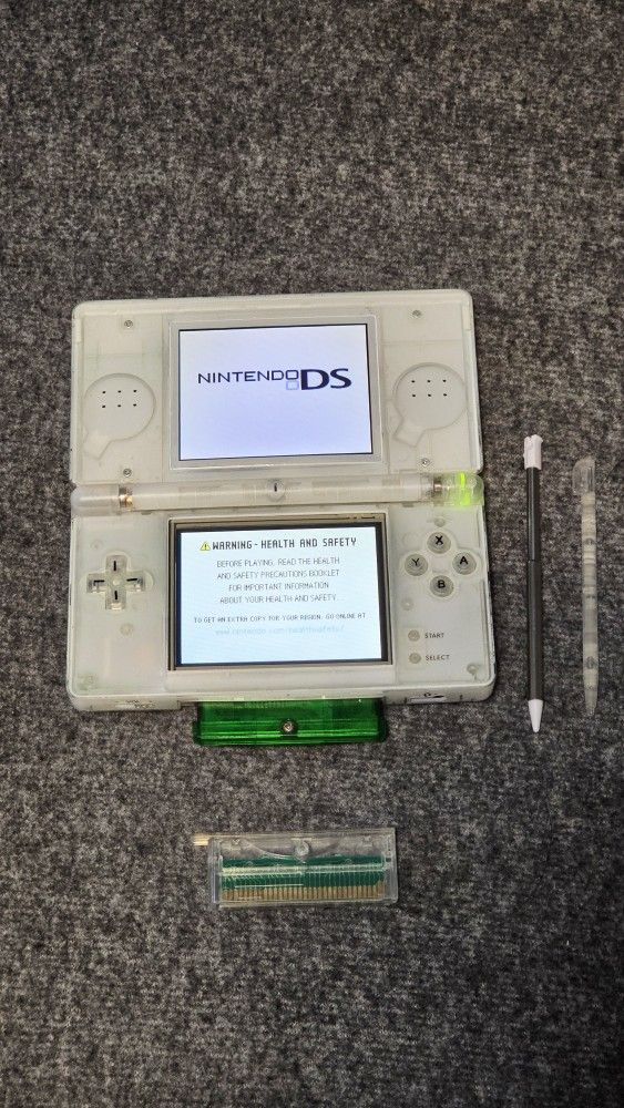 Transparent shell modification with airbrushed "skeleton white" inner layer. Includes clear cartridge protector, clear stylus, telescoping metal stylus, charger and Pokémon Emerald (reproduction)