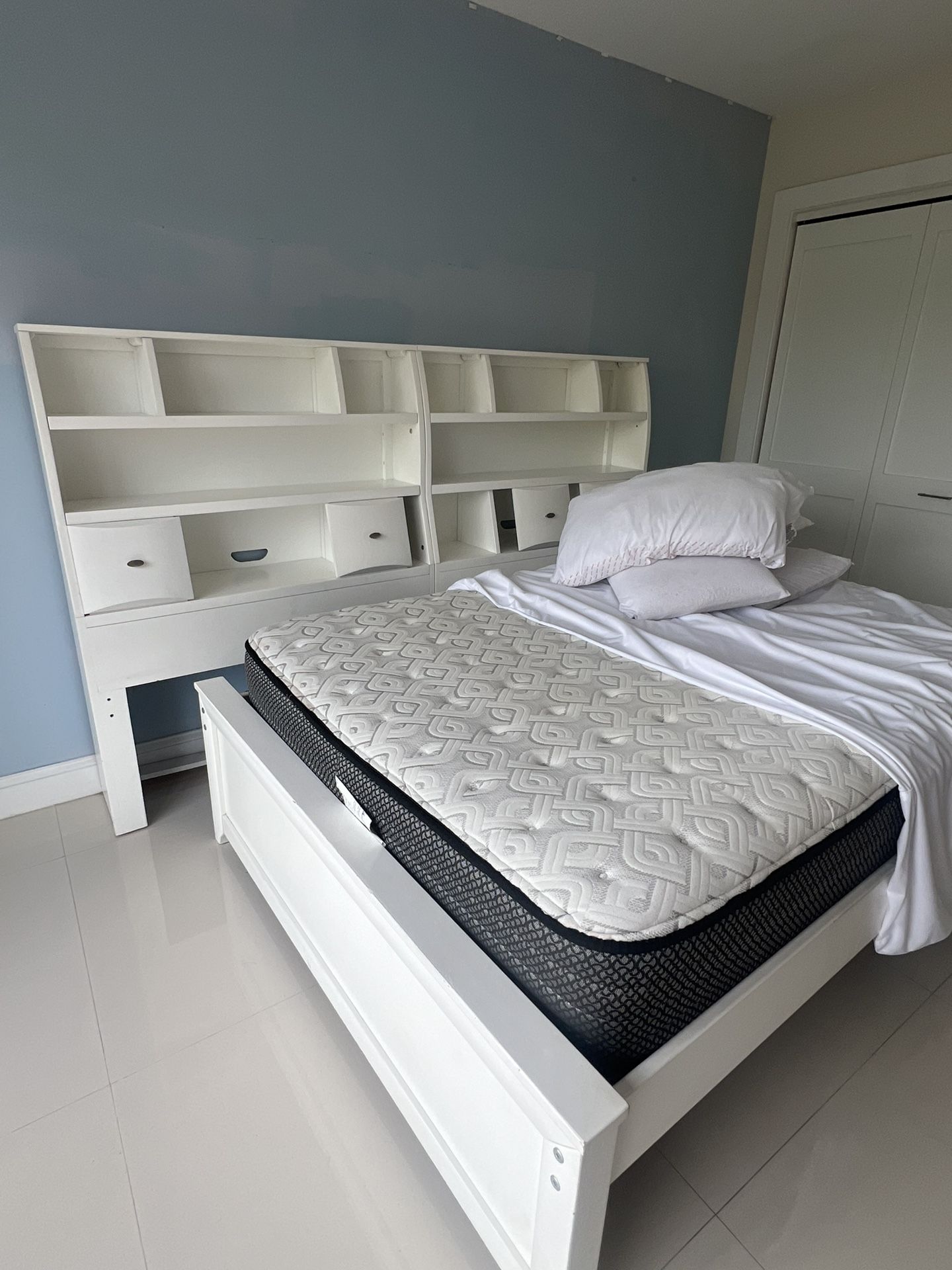 Bed already gone 2 book shelves available - selling together or separate selling to best offer (149 each) Bedroom Set for Sale – Like New! Full-size bed + 2 matching bookshelves. All in impeccable condition, Modern, clean look – perfect for any space. Ready to pick up. Bed is already unarmed Great value!j Can sell bookshelves separate - ask for price