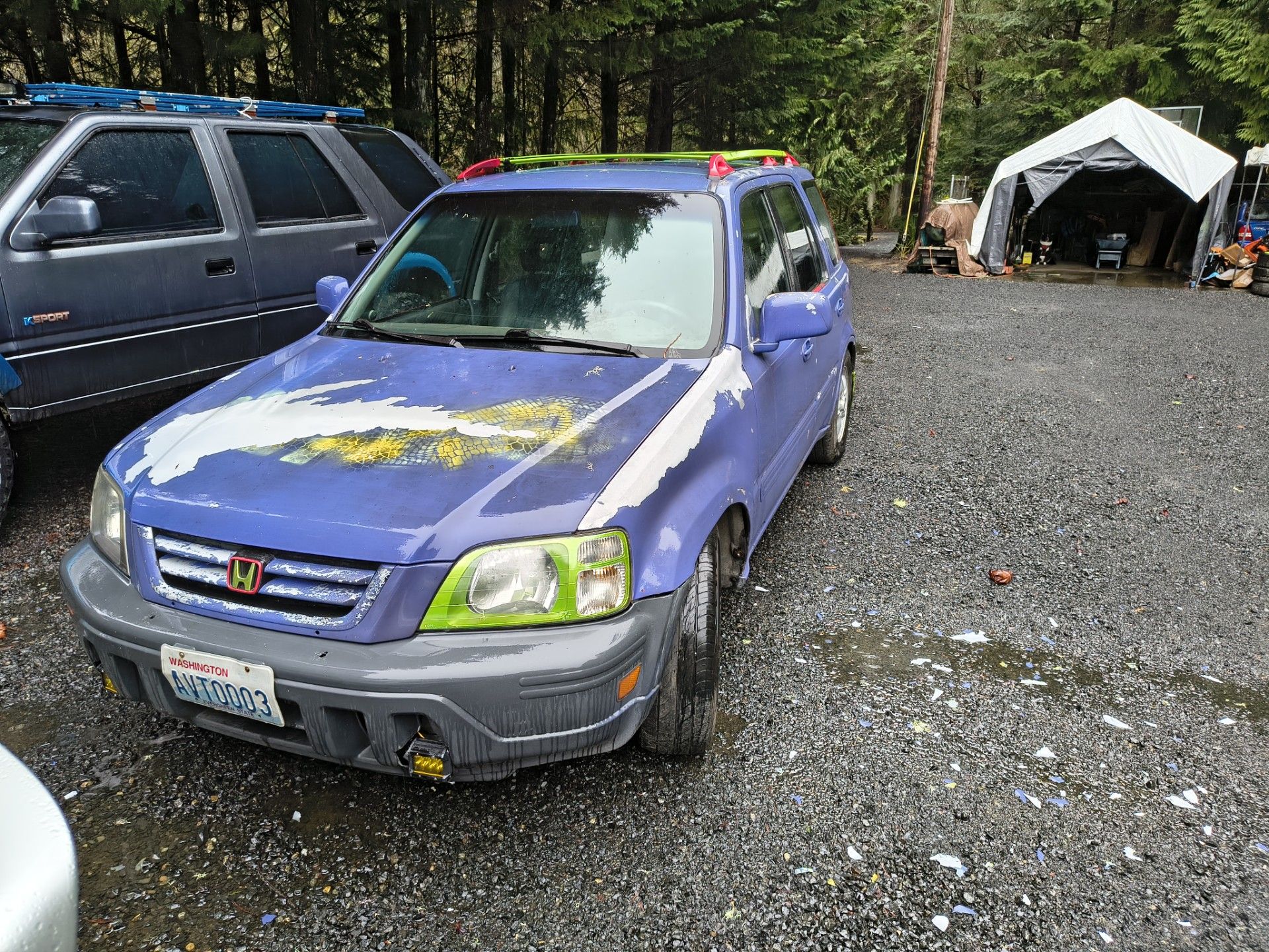 1999 Honda Cr-V with around 280,000 mi. AWD automatic transmission with the 2.0 liter b-series inline 4-banger. I've owned for over a decade and she served me well, time to pass her on. Lowered on tru-hart coilovers + every possible suspension part that's adjustable, notice wheel camber close to neutral. If you're not comfortable working on cars this one's not for you, highly modified. I gutted the interior from front seats back within days of buying, so I present that setup to the next owner. Starts/runs/drives very well, burns a bit of oil as expected for the mileage. Never had a problem with the transmission, it was never that smooth but always did its job. Back on OE 15" wheels, they're in nice shape but the tires are old and haven't seen action for long time. The once perty purple paint job is obviously failing. My first complete paint job and I used an industrial urethane that I believe was an indoor formulation containing no UV inhibitors or something along those lines. Good news is the body is great under all the peeling paint, including custom front fenders and spare tire delete on the tailgate. Lots of lil things, mostly electrical, not working, have been worked around, or gotten rid of. No power locks, cooling fan controlled by a switch on the dash, prob other things just can't remember at the moment. I added a real oil pressure gauge and digital voltage readout. Led headlight bulbs in the yellow end of light spectrum, bright yellow fog lamps too. Third brake light in the hatch is from a Cadillac, runs almost the width of the hatch. True CAI shielded from engine and drawing from wheel well at bottom of front bumper. Could go any number of directions with this project car. Clean title in my name, asking 1,000$ https://offerup.com/redirect/?o=by5ibw==. will consider trades