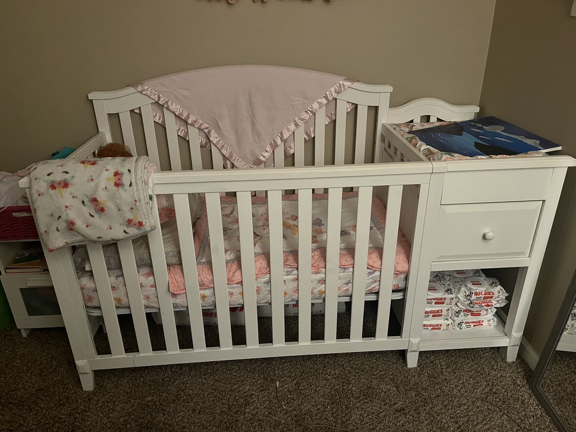 Like brand new a few minor scratches NO cracks! Has room for storage under changing table and a drawer as well. DOES NOT COME WITH MATTRESS!