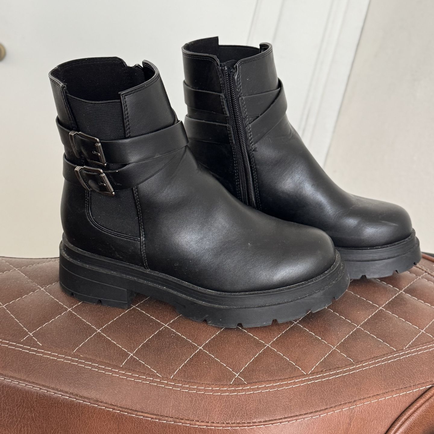 Gently worn SODA black ankle boots with side zipper + double buckle detail. Chunky lug sole, comfortable and easy everyday boot. • Women’s 7.5 • Excellent condition – minimal wear • Clean, smoke-free home • Ready to wear Located in Crown Point (Pacific Beach area) for easy pickup.