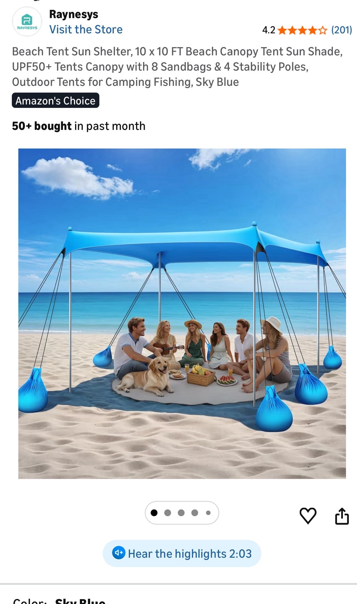Beach Tent Sun Shelter, 10 x 10 FT Beach Canopy Tent Sun Shade, UPF50+ Tents Canopy with 8 Sandbags & 4 Stability Poles, Outdoor Tents for Camping Fis