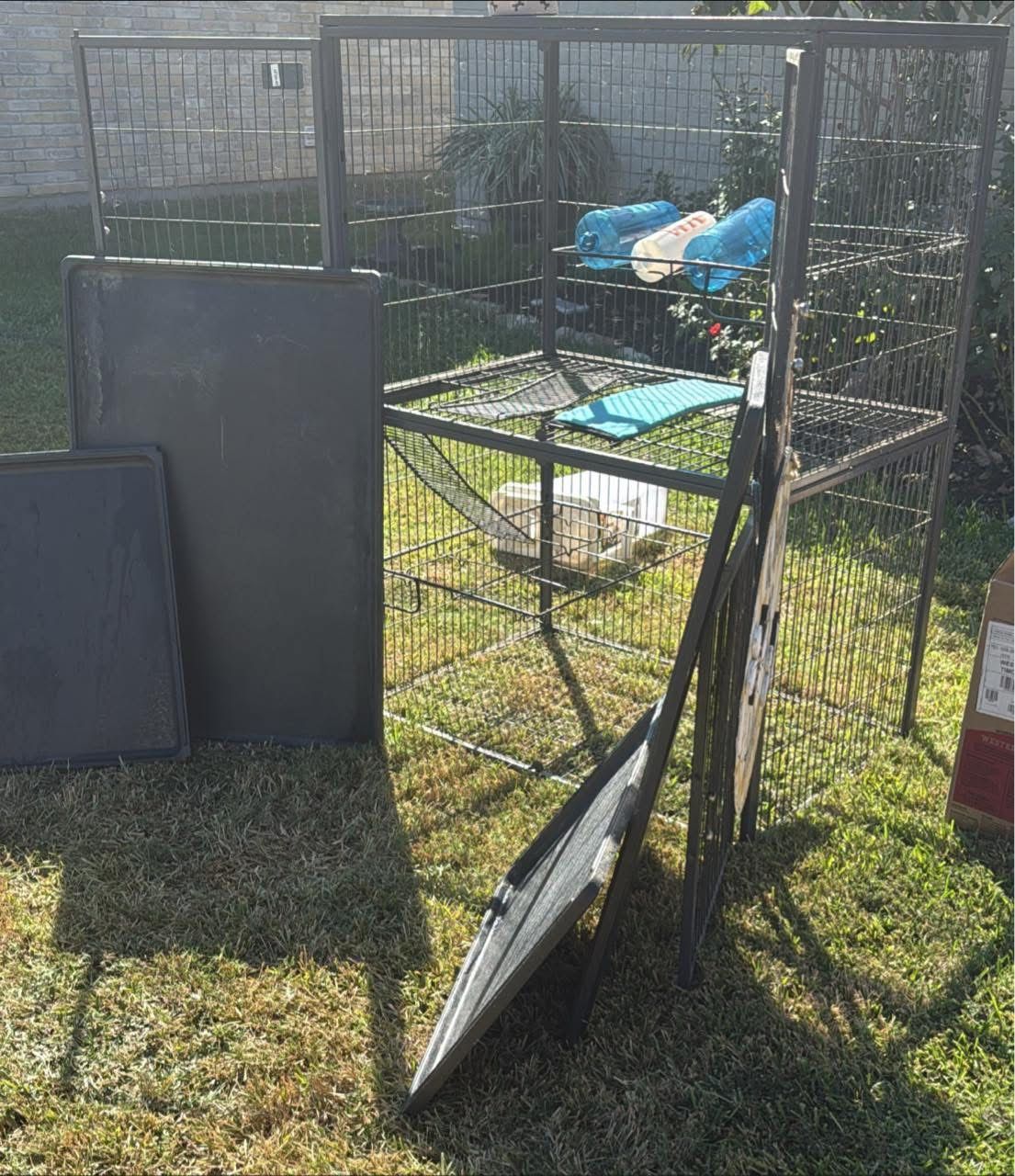 Large cage, 3 water bottles, 1 pet food container, 1 small feeder, and 1 small bowl included