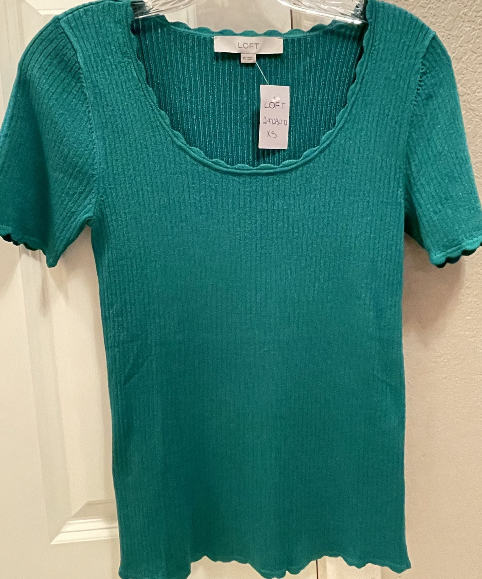 New Loft green sweater in size extra small (S) with a sculpted neckline and a bit of shimmer. Sweater is new with tags selling for $15.00
