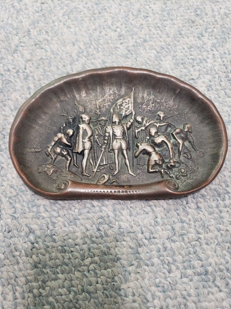 Vintage bronze metal dish of Landing of Columbus. In great condition. Measures 7" x 4.5".