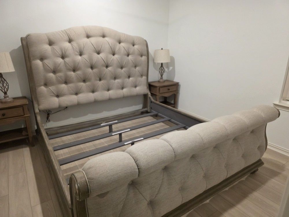 This King Bedroom set is upholstered and made of solid oak wood. The set is made by ART Furniture and was purchased from Nebraska. It is well constructed and very solid and heavy. The set comes with the king bed and two matching night stands. We are downsizing to a queen bed due to smaller space in our new home. This set was purchased for over $2,500. Priced reduced to sell.