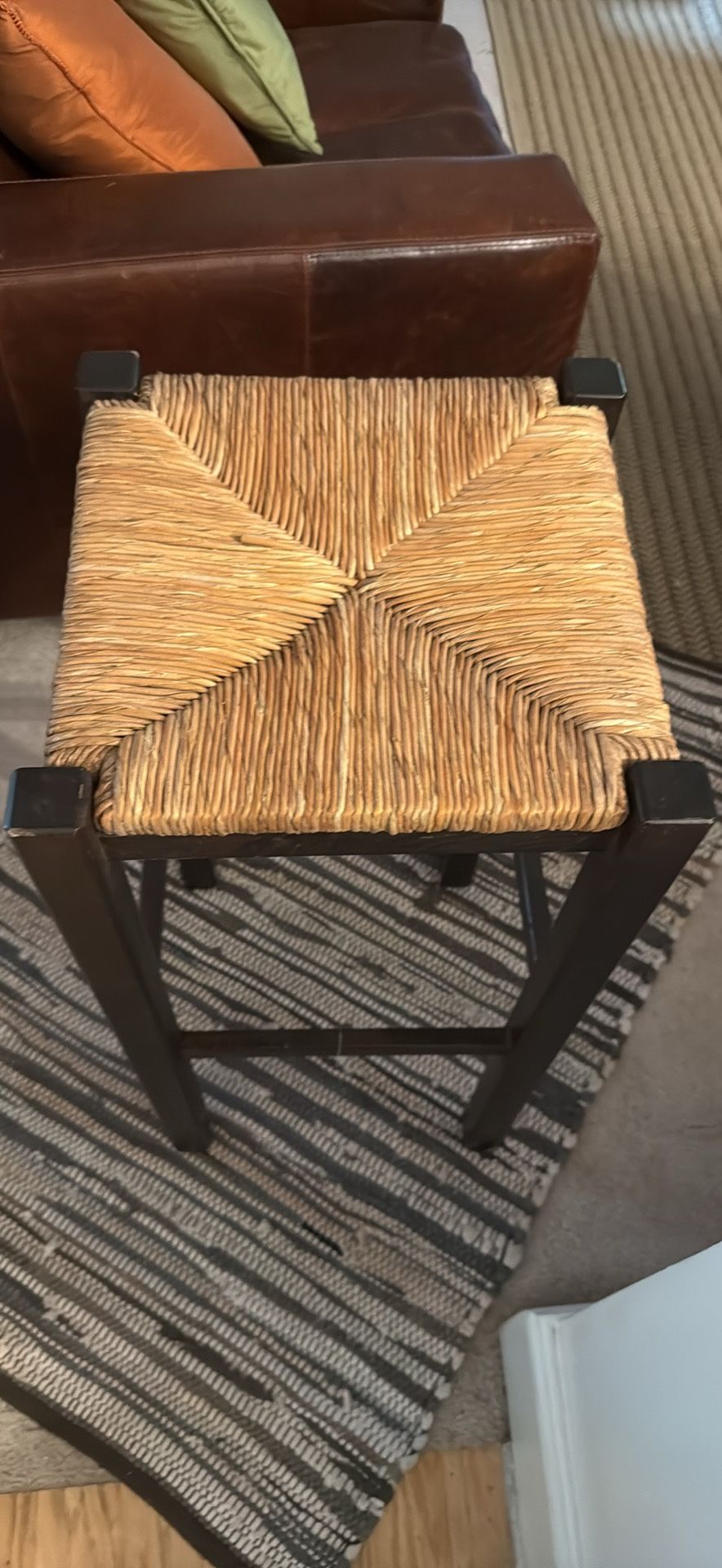 Brown wood bar stools with sea grass seats