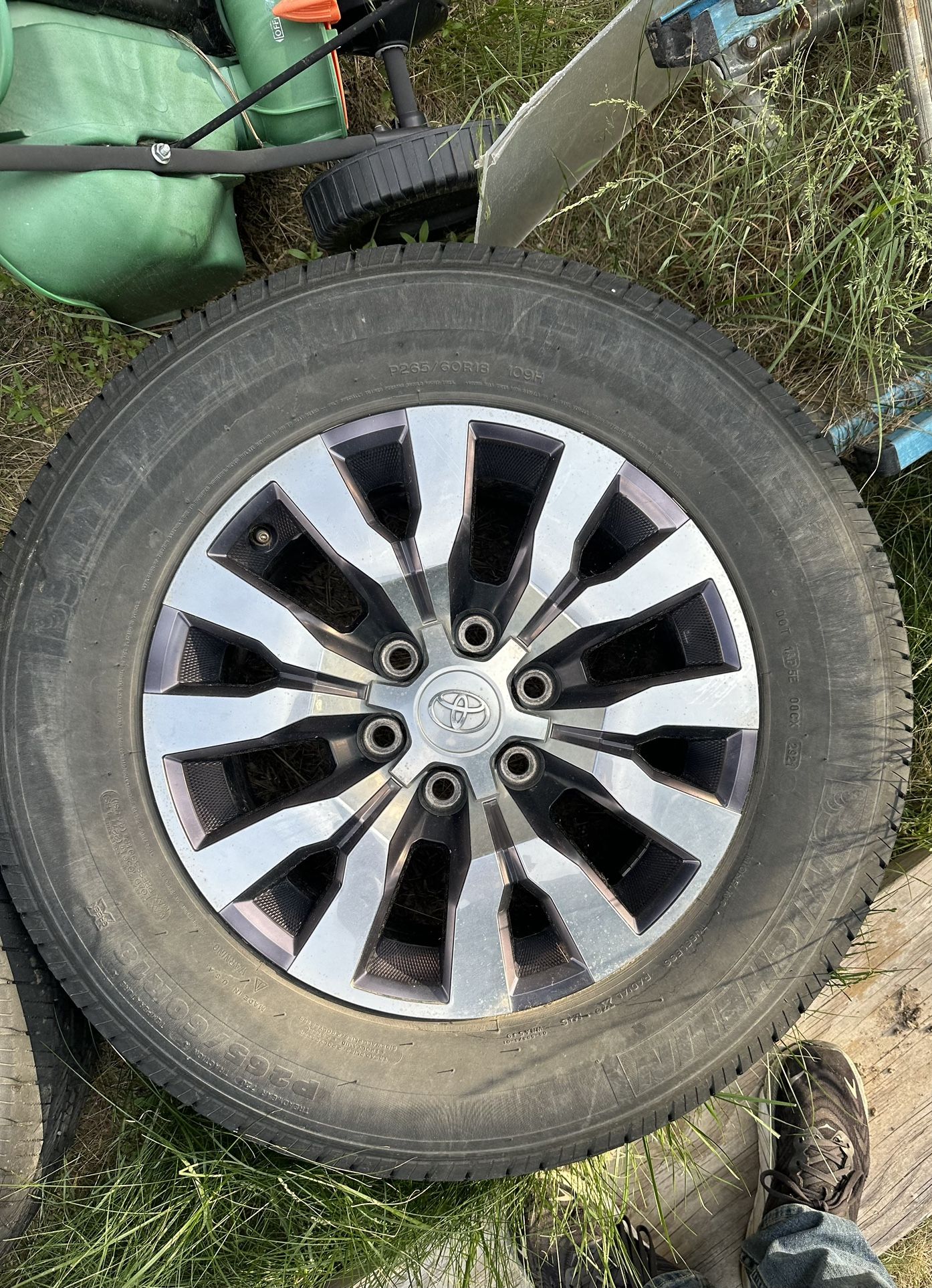 Came off my 2019 Toyota Tacoma TRD pro. Low mileage but bad tire wear on two of them because of my lift before I upgraded to bigger wheels and tires. P265/60R18 Blot pattern I believe is 6x139.7 (6x5.5) Message me if you have any questions Willing to meet up Open to offers
