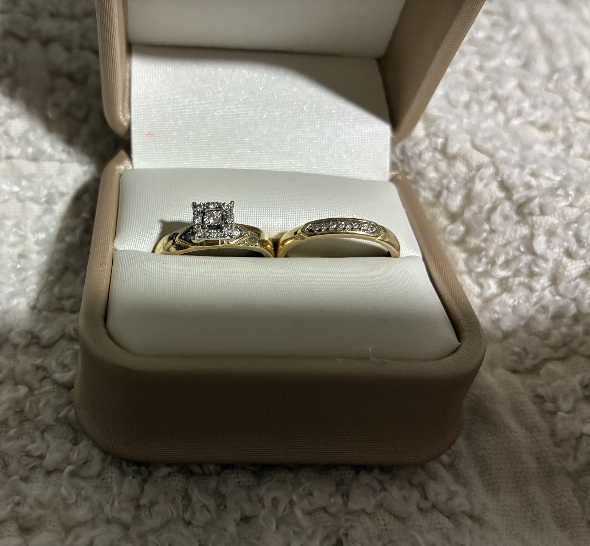 π Bridal Ring Set β 14k Gold + Diamonds Engagement ring with square diamond halo Matching diamond band 14k yellow gold Just need a lightly polished to restore shine π° $1000 β Pick Up Only (Price negotiable)