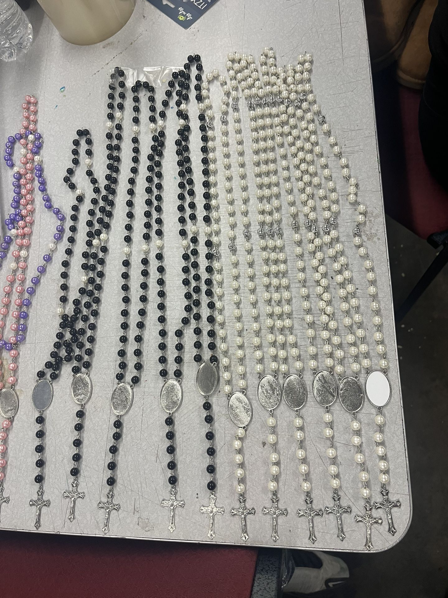 Custom rosaries with any picture (blqck and white available currently, I can also get any other color, just message me). I also have bulk pricing, just message me!! Resin topped to protect print!