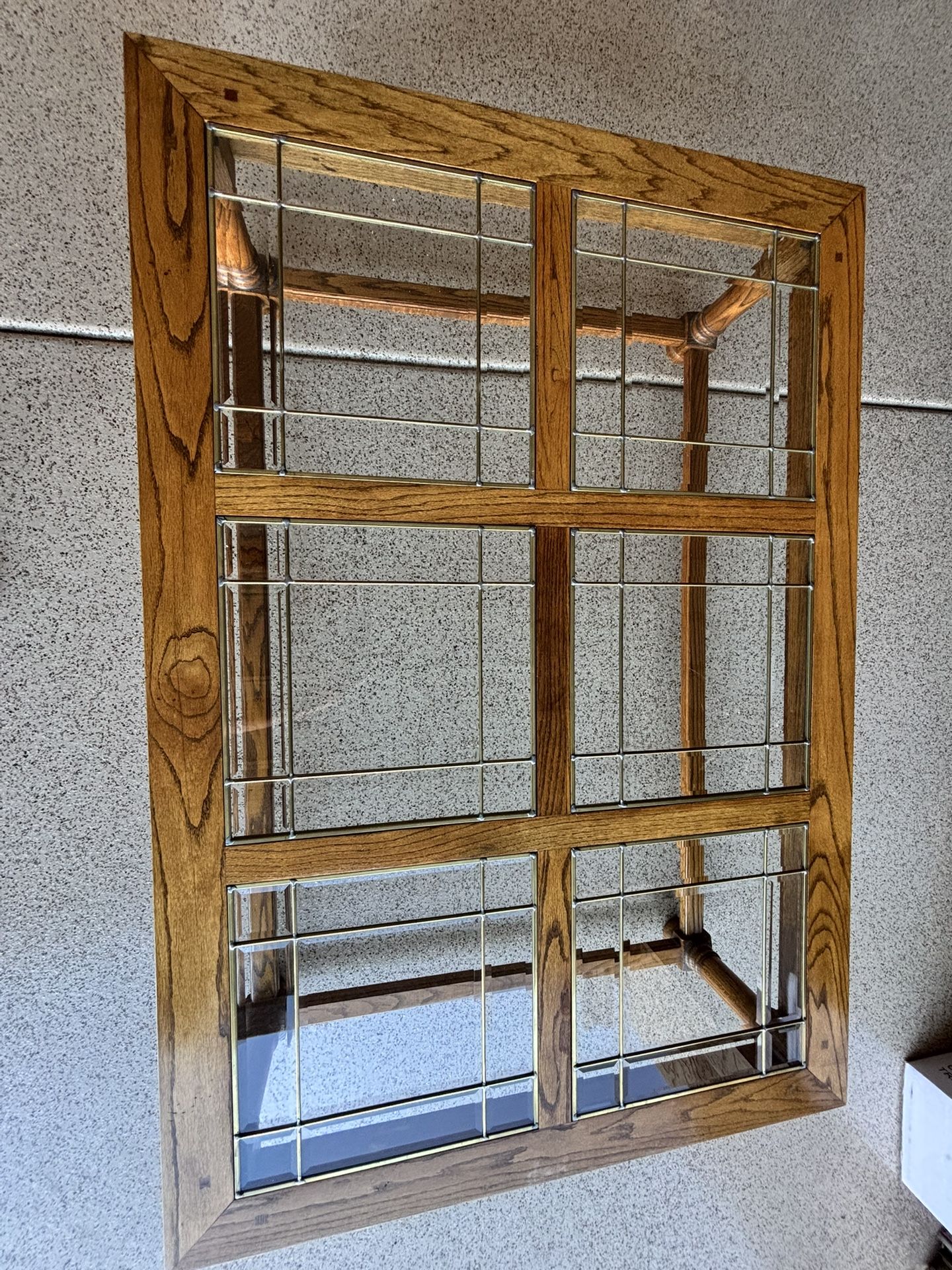 Oak coffee table with glass inserts. L60in x W42in x H16.5in