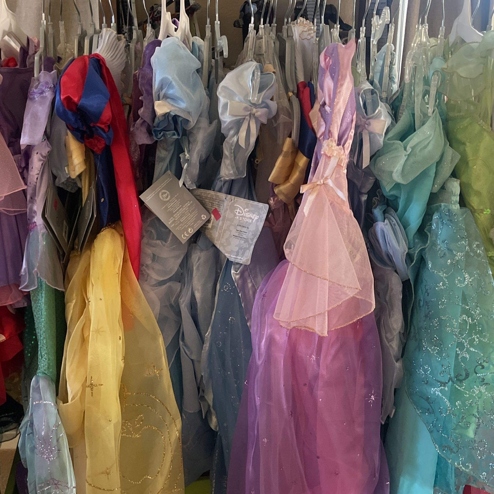 All costumes are brand new with tags original from the Disney store. These were purchased for resell from all over the country. Price range is $45-$250. Cinderella Sleeping Beauty Ariel Sophia the Great Alice in Wonderland Mulan Red Minnie Mouse Pink Minnie Mouse Princess Belle Tinker Bell Hannah Montana Pocahontas Snow White Doc McStuffins Elizabeth Swann(Pirates of the Caribbean) Most sizes available in all costumes Size 4 5/6 7/8 10 I do have various infant sizes starting at 12 to 18 months, 18 to 24 months, 2T , and a few 3’s. I most likely have shoes available as well but sizes could be limited. Wands, Tiaras misc accessories Boys costumes available as well. Spider-Man. Incredible Hulk Captain America. Peterpan. Jack Sparrow Jacob and the Neverland Pirates Captain Hook Not as many options with boy sizes Hard to photograph and picture of them. All styles vary with sizes in some situations