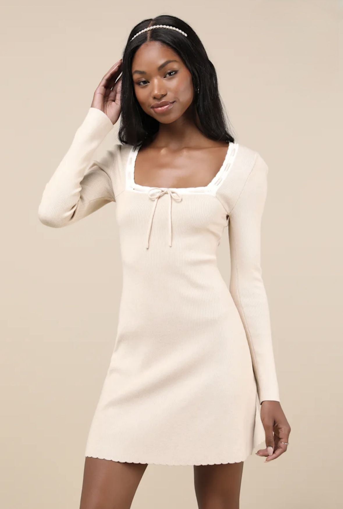 Lulus Definitely Sweet Beige Scalloped Long Sleeve Mini Sweater Dress
