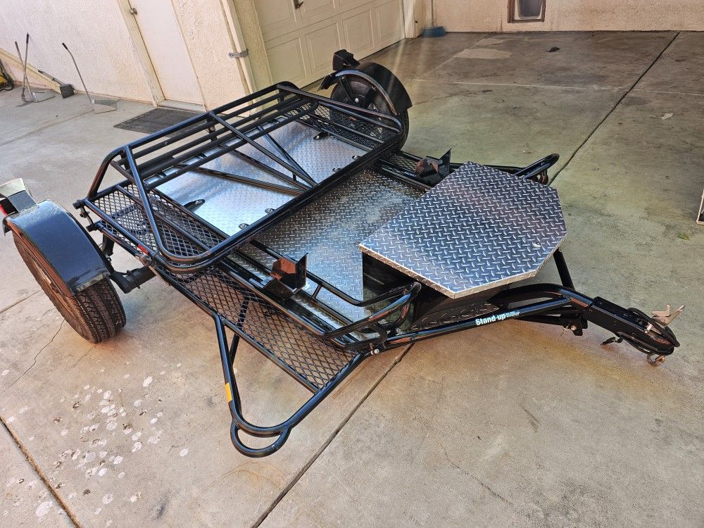 Kendon Dual cargo bike trailer with utility box with key, spare tire, lights in working condition, no damage, no rust, chrome wheels, easy to stand up for storage, tires are like new, pink slip in hand, with plates and all. Ready to use.