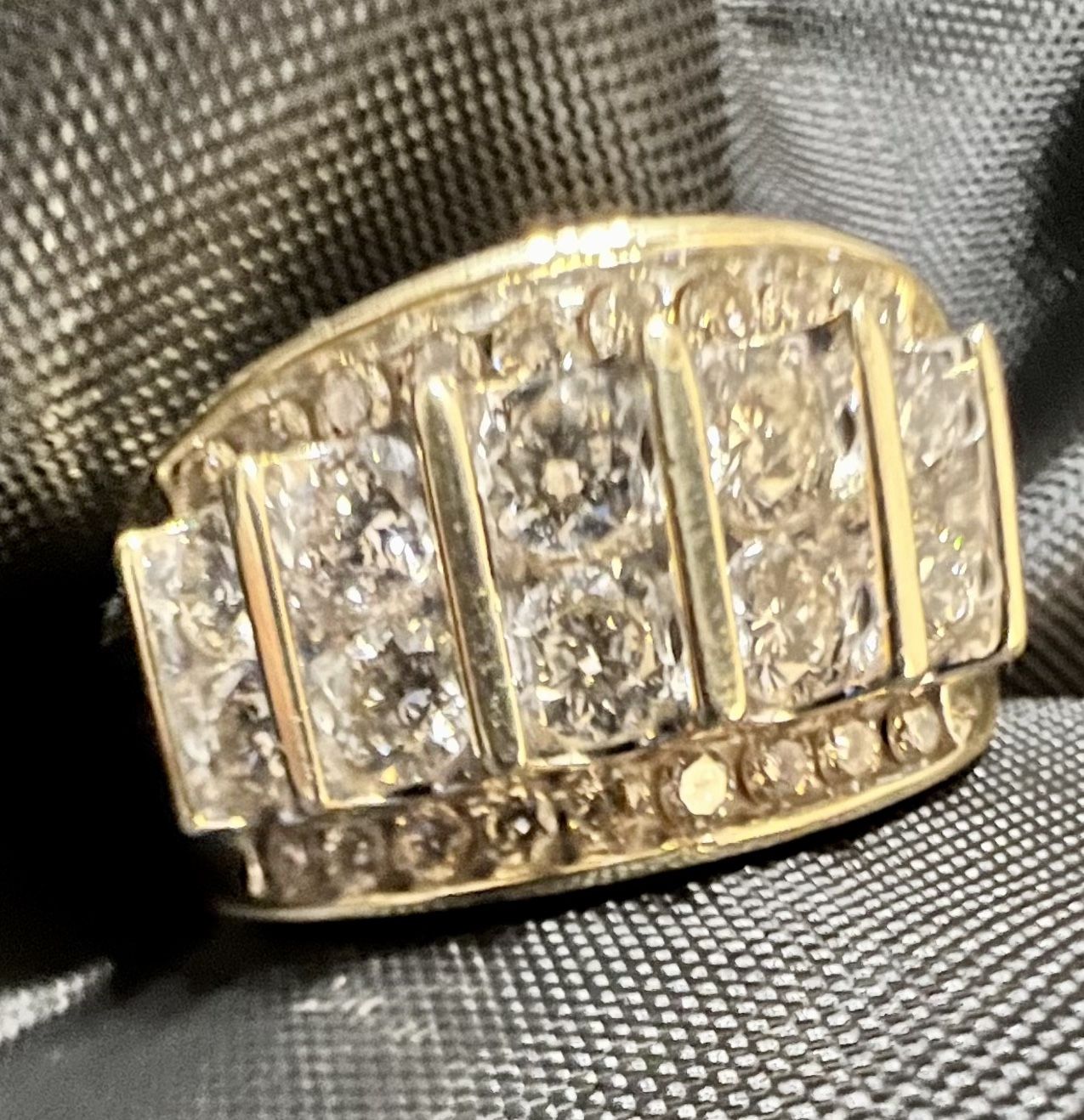 Men’s 2CTTW 10k YG Diamond Column Ring. Clarity I2, round cut white diamonds (L). Retail is $4,000, was bought new - no resizing has been done.