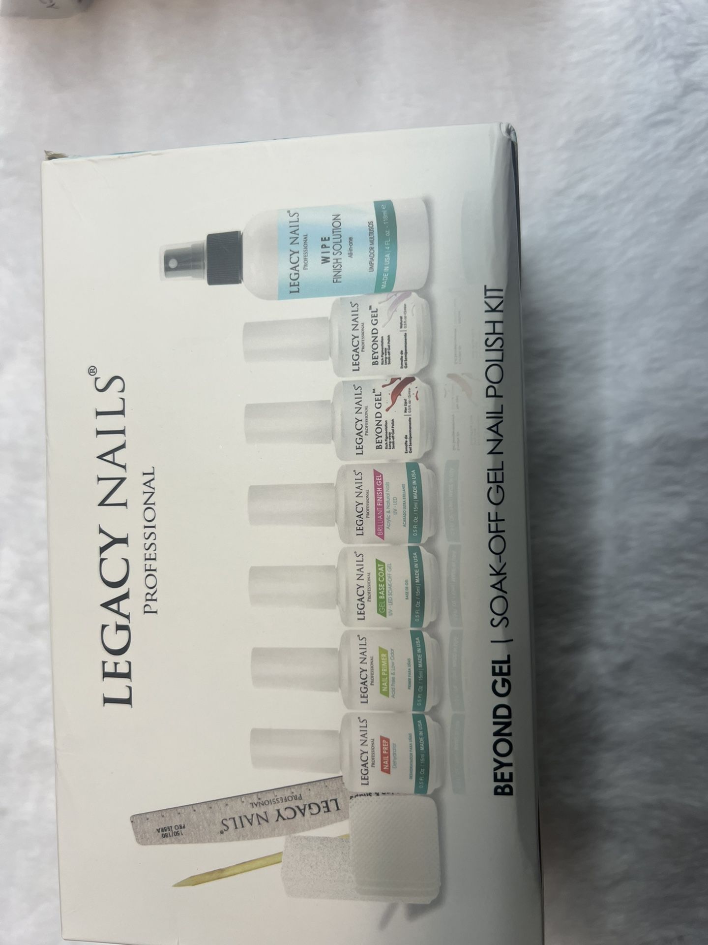 GEL POLISH NAIL KIT Product List: Pro Zebra nail file - 150/180. Spongie nail file - 100/180. Nail prep - 0.5 oz. Nail Primer - 0.5 oz. Gel base coat - 0.5 oz. Beyond gel polish - 0.5 oz. (2) colors. Nail white buffer. Lint-free wipes 10 pcs. Orange sticks 2 pcs. Brilliant finish gel - 0.5 oz. Wipe finish solution - 4 oz.