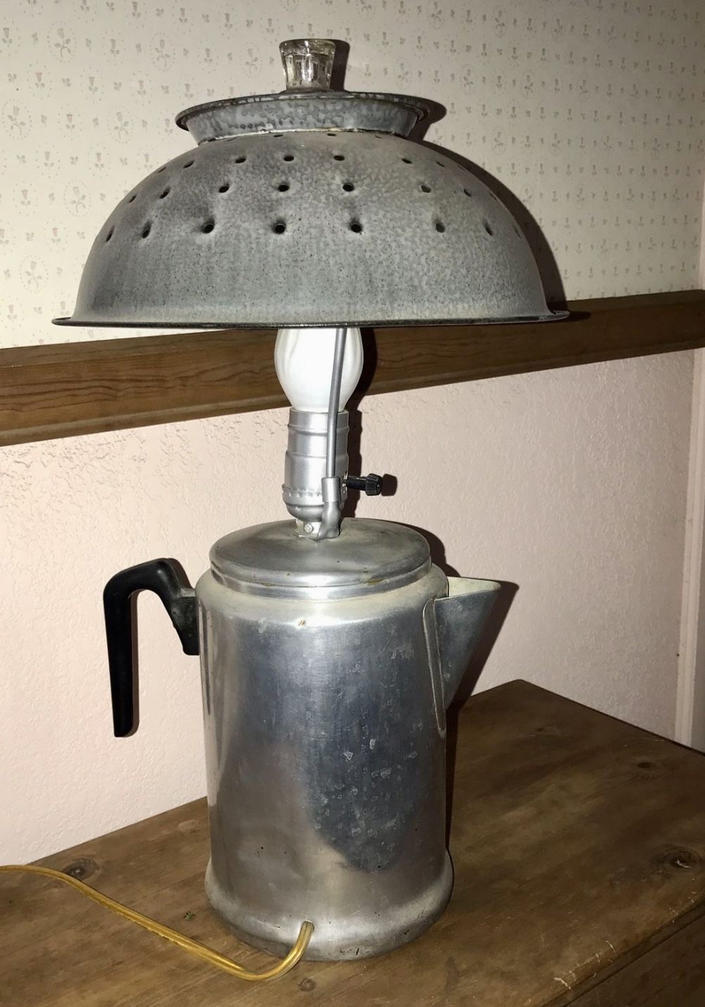 Vintage folk art table lamp made from a camping percolator coffee pot and a colander.
