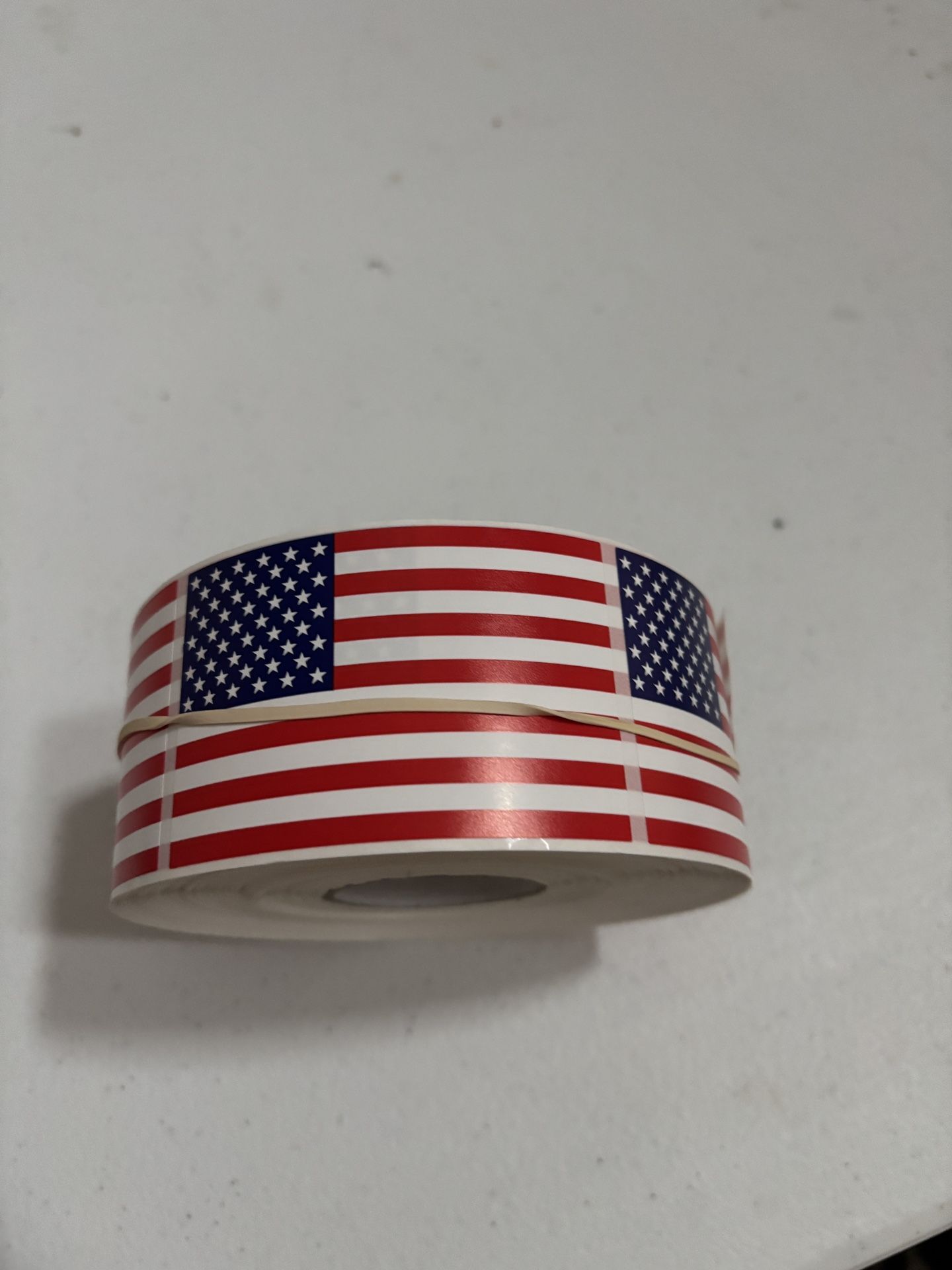 Roll of stickers featuring the American flag design. Approximately 900 stickers.