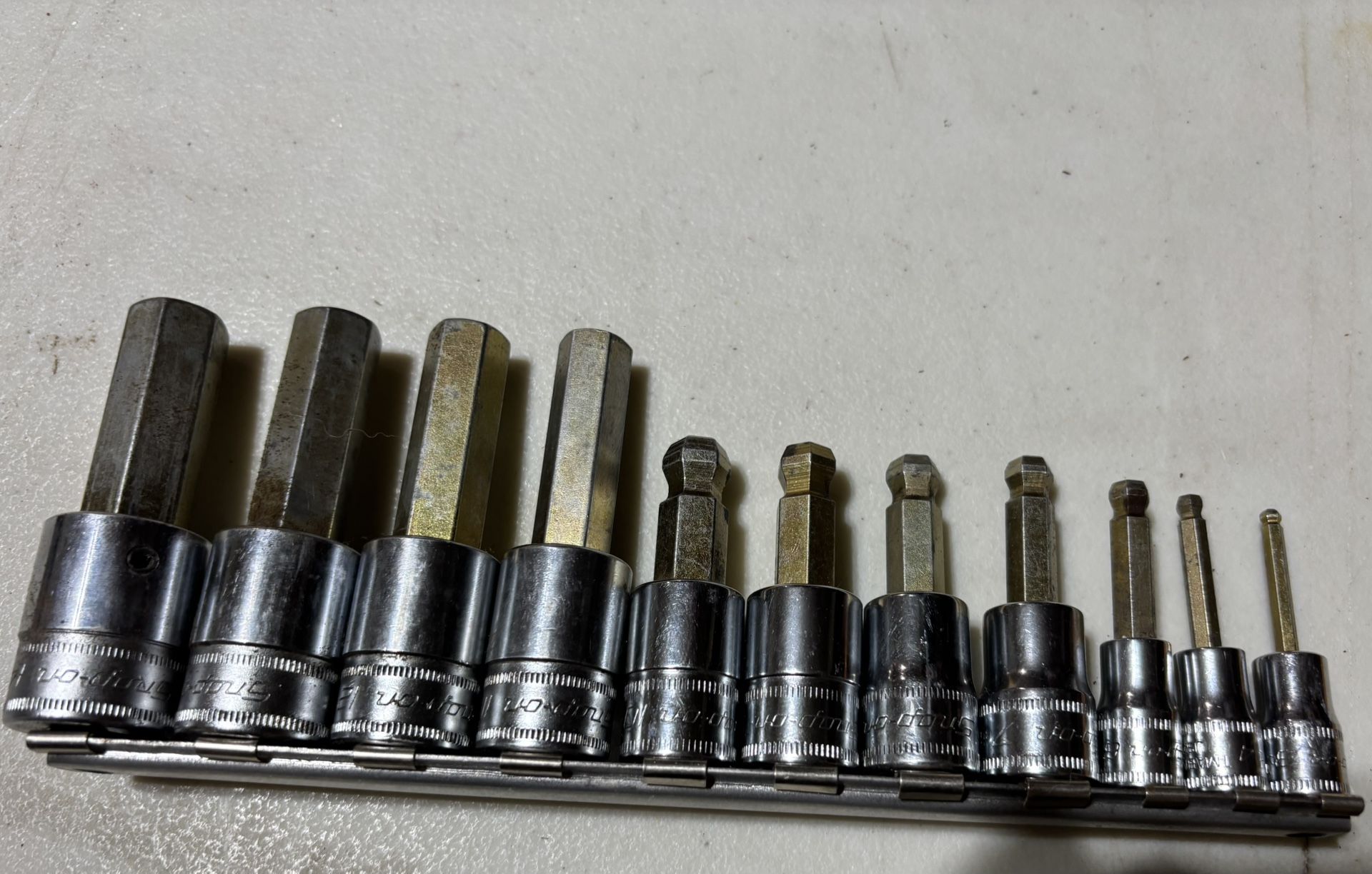 11 piece Snap-On 3/8” drive Metric Socket set. It is in very good condition. The from 3mm to 14mm. Missing 5mm. Asking $145.