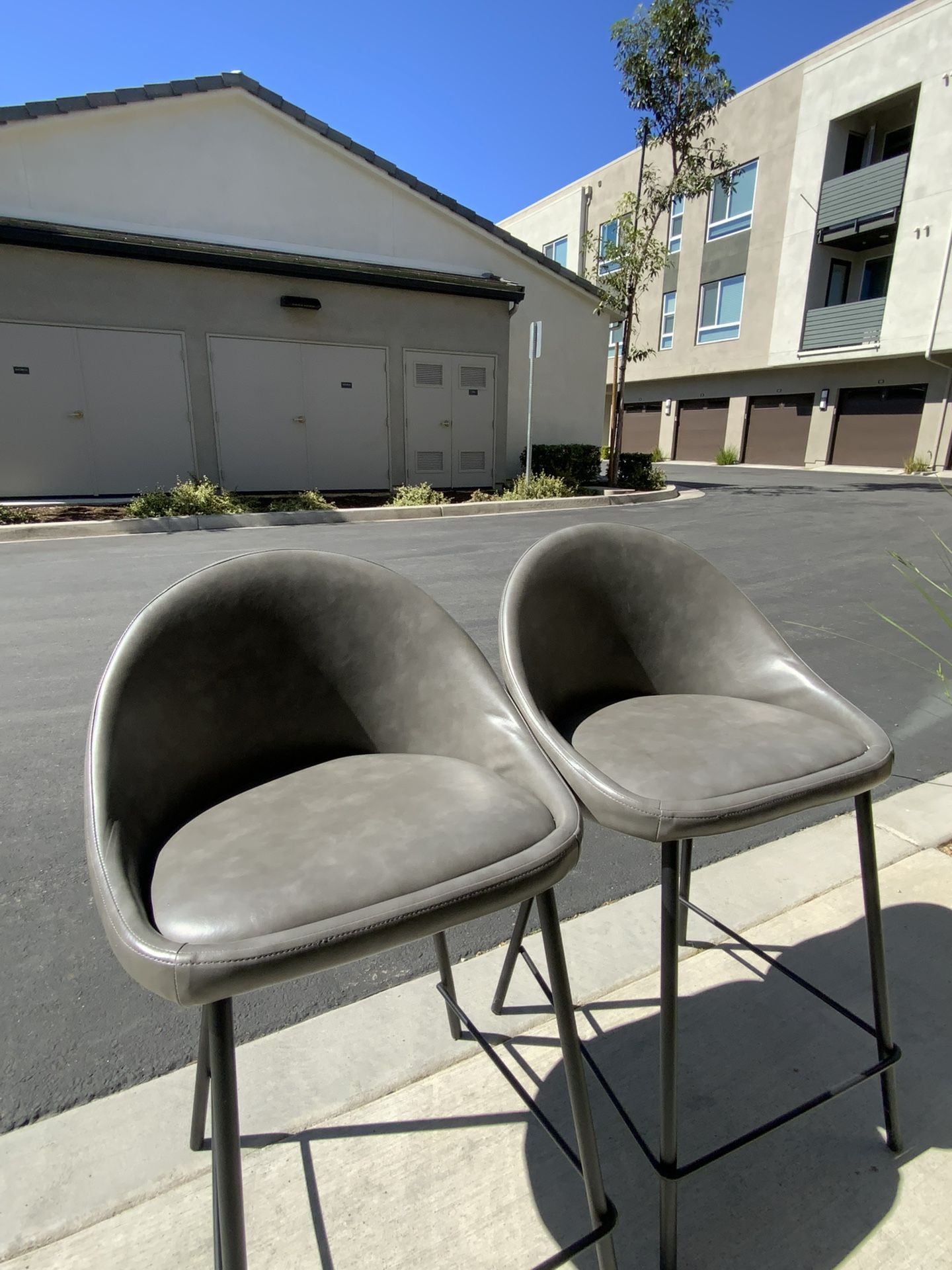 Condition Very good condition. Both stools are sturdy and fully functional with light normal wear from regular use. Upholstery is clean and the metal legs are stable. Details Set of two modern upholstered counter height bar stools featuring a curved bucket-style seat and durable metal legs. The ergonomic curved design provides comfortable seating while maintaining a sleek contemporary look. These stools are ideal for kitchen islands, bar counters, or high dining tables. The neutral tone upholstery pairs easily with modern or minimalist home decor. Features Curved bucket style seat design Comfortable upholstered seating Strong metal legs with footrest Modern minimalist design $75 For Just One $100 total if you buy both