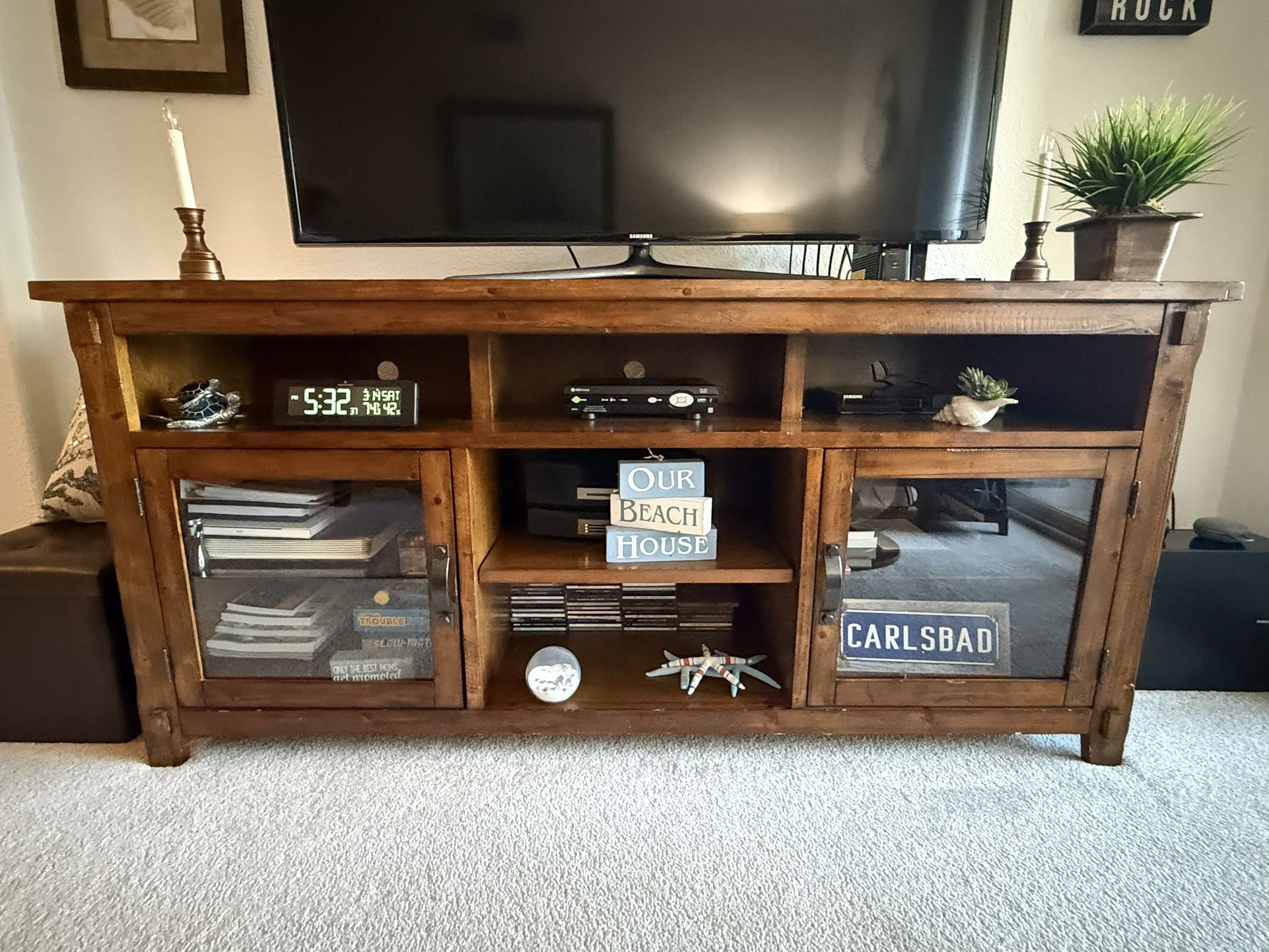 We’re moving! Beautiful TV Stand. Top has slight crack that can be filled in with marker. 73” L x 18.75” W x 33.5 H Located on 2nd floor; will take 2 people to remove.