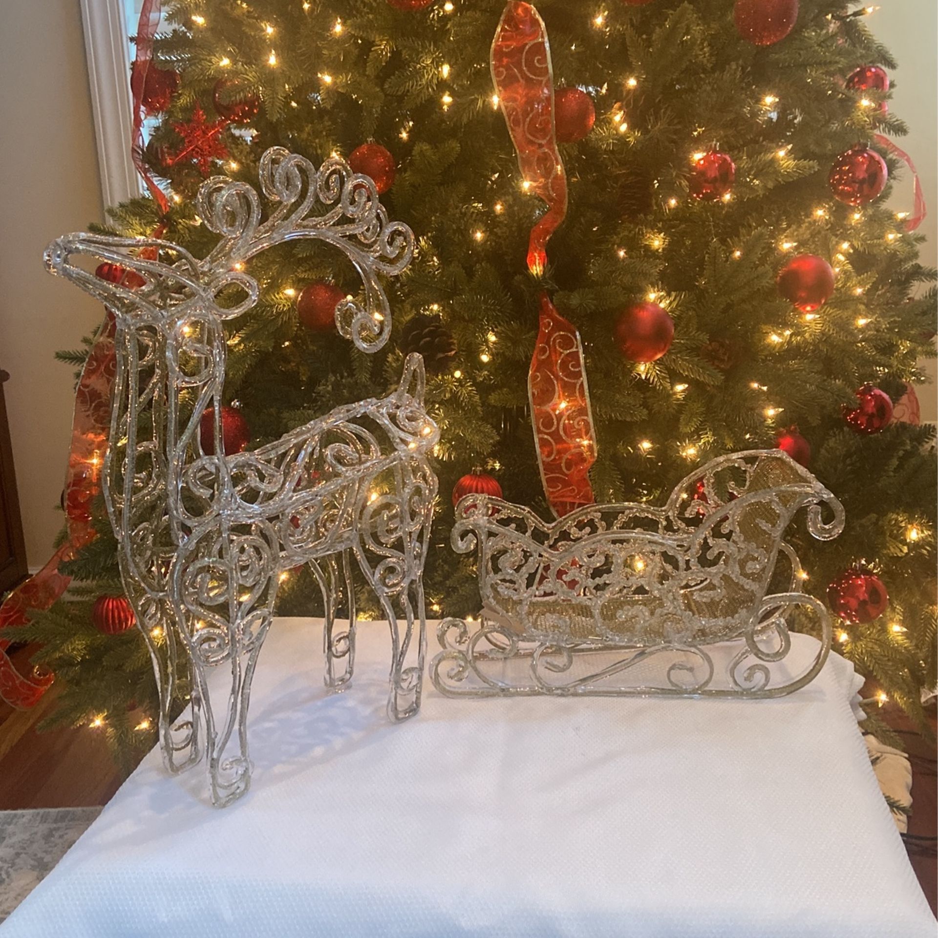 Christmas Reindeer & Sled Metal covered in gold glitter with clear plastic coating. Really nice and festive.