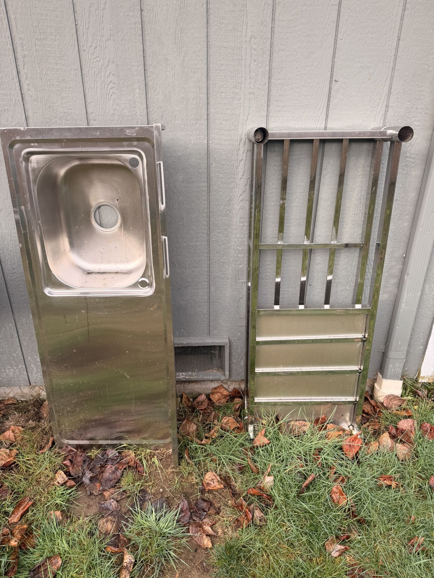 Stainless steel sink and matching stainless drying rack, along with a bin of assorted plumbing parts and accessories. Perfect for a workshop, garage, outdoor kitchen, utility room, or DIY project. Includes: • Stainless steel sink (drop-in style, drain opening included) • Stainless steel drying rack / shelving unit • Assorted plumbing parts: drain components, hoses, fittings, connectors (see photos) Sink and rack are solid and functional with normal wear from use. Plumbing parts are a mix of new and lightly used items — great for someone finishing a sink install or needing spare parts. Great for: • Workshop or garage sink setup • Utility or laundry room • Outdoor kitchen or prep area • DIY or remodel projects Selling as a bundle preferred, but may separate depending on interest. 📍 Local pickup 💬 Message me with questions or offers