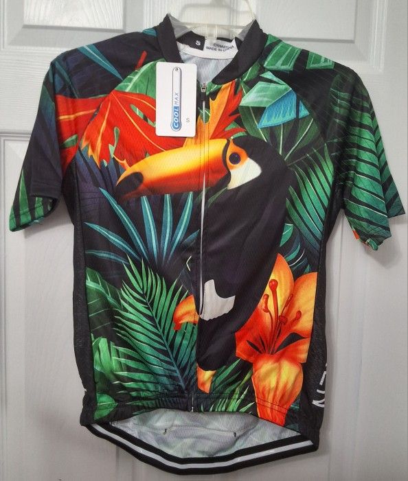 Cyhaen Coolmax Cycling jersey, zip front, back pockets, new with tags, size small, multi colored with tropical pattern, short sleeves. From a smoke free/pet free environment.